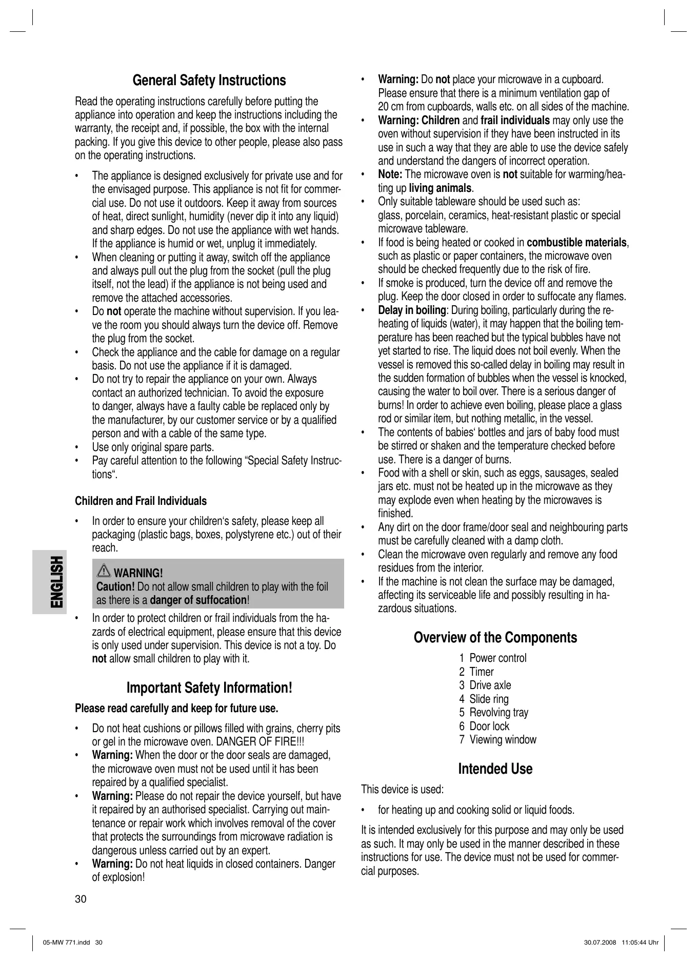Warning: When the door or the door seals are damaged, the microwave oven must not be used until it has been repaired by a qualified specialist. Warning: Please do not repair the device yourself, but have it repaired by an authorised specialist. Carrying out maintenance or repair work which involves removal of the cover that protects the surroundings from microwave radiation is dangerous unless carried out by an expert. Warning: Do not heat liquids in closed containers. Danger of explosion!