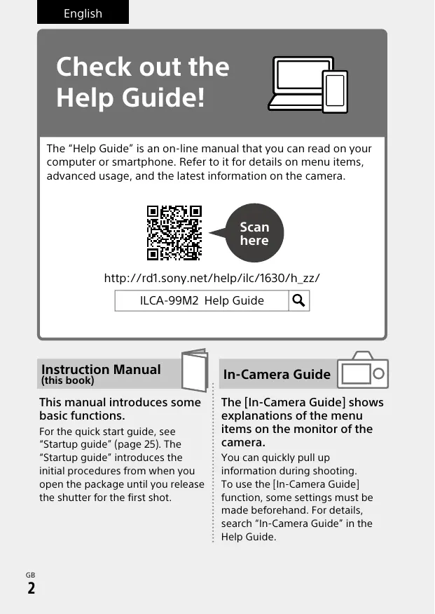 Guide”) “Help Guide” is an on-line manual. Refer to it for indepth instructions on the many functions of the camera.