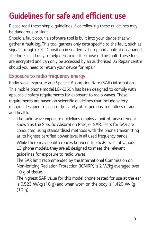 Informations sur l'exposition aux ondes radio et sur le débit d'absorption spécifique (SAR, Specific Absorption Rate). Le téléphone portable LG-K350n est conforme aux exigences de sécurité relatives à l'exposition aux ondes radio. Ces exigences sont basées sur des recommandations scientifiques qui comprennent des marges de sécurité destinées à garantir la sécurité de toutes les personnes, quels que soient leur âge et leur condition physique. • Les recommandations relatives à l'exposition aux ondes radio utilisent une unité de mesure connue sous le nom de débit d'absorption spécifique (DAS). Les tests de mesure du DAS sont effectués à l'aide de méthodes normalisées, en utilisant le niveau de puissance certifié le plus élevé du téléphone, dans toutes les bandes de fréquence utilisées. • Même si tous les modèles de téléphones LG n'appliquent pas les mêmes niveaux de DAS, ils sont tous conformes aux recommandations appropriées en matière d'exposition aux ondes radio.