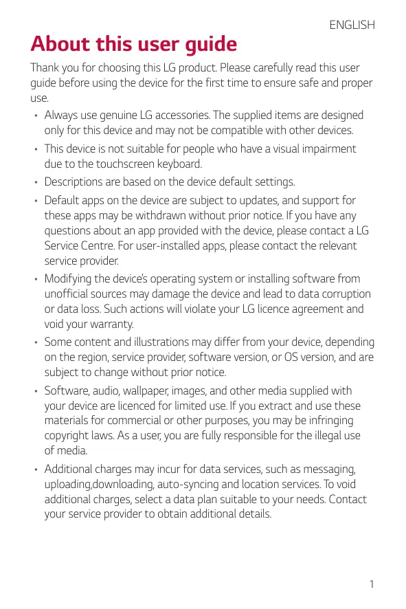 ENGLISH About this user guide Thank you for choosing this LG product. Please carefully read this user guide before using the device for the first time to ensure safe and proper use. • Always use genuine LG accessories. The supplied items are designed only for this device and may not be compatible with other devices. • This device is not suitable for people who have a visual impairment due to the touchscreen keyboard. • Descriptions are based on the device default settings. • Default apps on the device are subject to updates, and support for these apps may be withdrawn without prior notice. If you have any questions about an app provided with the device, please contact a LG Service Centre. For user-installed apps, please contact the relevant service provider. • Modifying the device’s operating system or installing software from unofficial sources may damage the device and lead to data corruption or data loss. Such actions will violate your LG licence agreement and void your warranty. • Some content and illustrations may differ from your device, depending on the region, service provider, software version, or OS version, and are subject to change without prior notice. • Software, audio, wallpaper, images, and other media supplied with your device are licenced for limited use. If you extract and use these materials for commercial or other purposes, you may be infringing copyright laws. As a user, you are fully responsible for the illegal use of media. • Additional charges may incur for data services, such as messaging, uploading,downloading, auto-syncing and location services. To void additional charges, select a data plan suitable to your needs. Contact your service provider to obtain additional details.