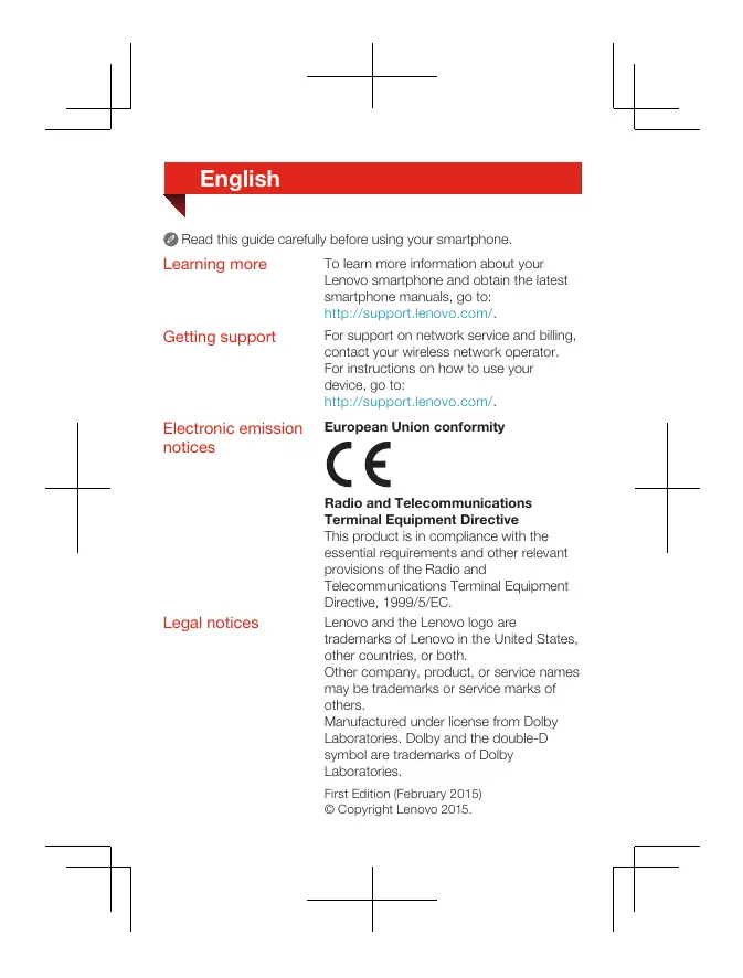 Radio and Telecommunications Terminal Equipment Directive This product is in compliance with the essential requirements and other relevant provisions of the Radio and Telecommunications Terminal Equipment Directive, 1999/5/EC. Lenovo and the Lenovo logo are trademarks of Lenovo in the United States, other countries, or both. Other company, product, or service names may be trademarks or service marks of others. Manufactured under license from Dolby Laboratories. Dolby and the double-D symbol are trademarks of Dolby Laboratories. First Edition (February 2015) © Copyright Lenovo 2015.