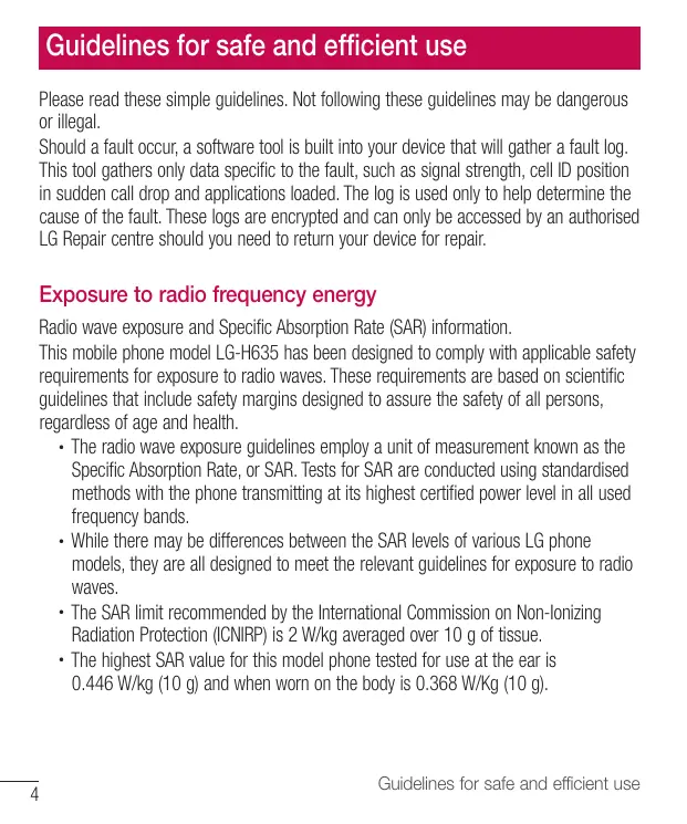 Guidelines for safe and efficient use Please read these simple guidelines. Not following these guidelines may be dangerous or illegal. Should a fault occur, a software tool is built into your device that will gather a fault log. This tool gathers only data specific to the fault, such as signal strength, cell ID position in sudden call drop and applications loaded. The log is used only to help determine the cause of the fault. These logs are encrypted and can only be accessed by an authorised LG Repair centre should you need to return your device for repair.