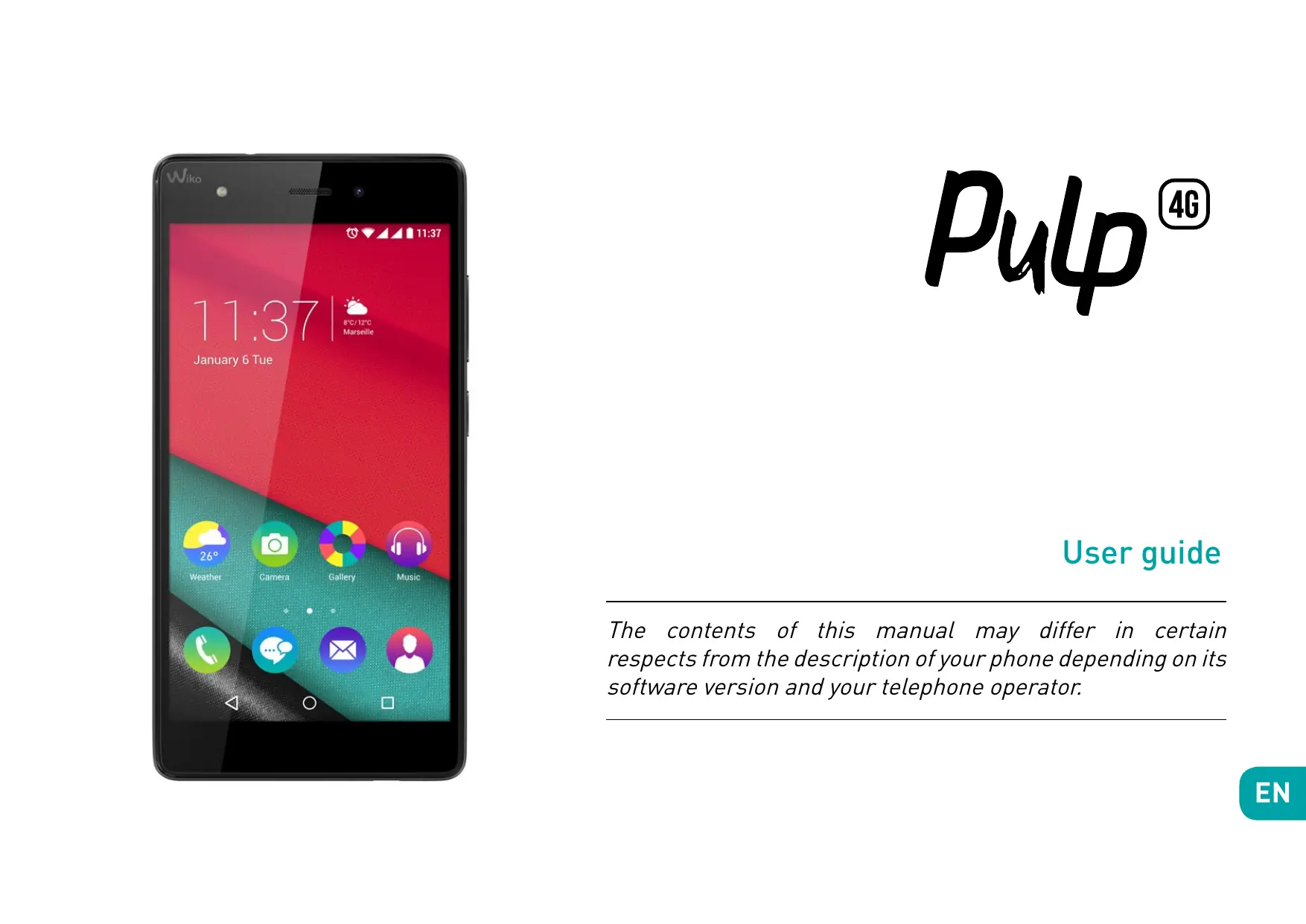 User guide The contents of this manual may differ in certain respects from the description of your phone depending on its software version and your telephone operator. CONGRATULATIONS ! You have just purchased your WIKO PULP 4G mobile phone. This guide contains all the information needed to use the phone so that you can quickly familiarise yourself, we hope, with the world of WIKO. information and recommendations contained herein do not constitute a guarantee under the Applicable law. WIKO reserves the right to change or modify the information contained in this manual at any time. Copyright © 2015 WIKO The information contained in this manual may not be disclosed to third parties or reproduced in any form whatsoever without the express written consent of WIKO. Limitation of Liability All content and services accessible through this device are the exclusive property of third parties and are protected by the relevant laws (copyright, patent, licence and/or other intellectual property laws). These services are for your own personal noncommercial use. It is not permitted to use any content or services without prior written permission of the content owner. You may not copy, publish, transfer, sell, create derivative works or exploit in any manner or medium any content or services displayed through this device. Trademarks WIKO is a registered trademark of WIKO SAS. Disclaimer This manual has been prepared with the utmost care and attention and is designed to guide you through the functions and features of your device. However, the