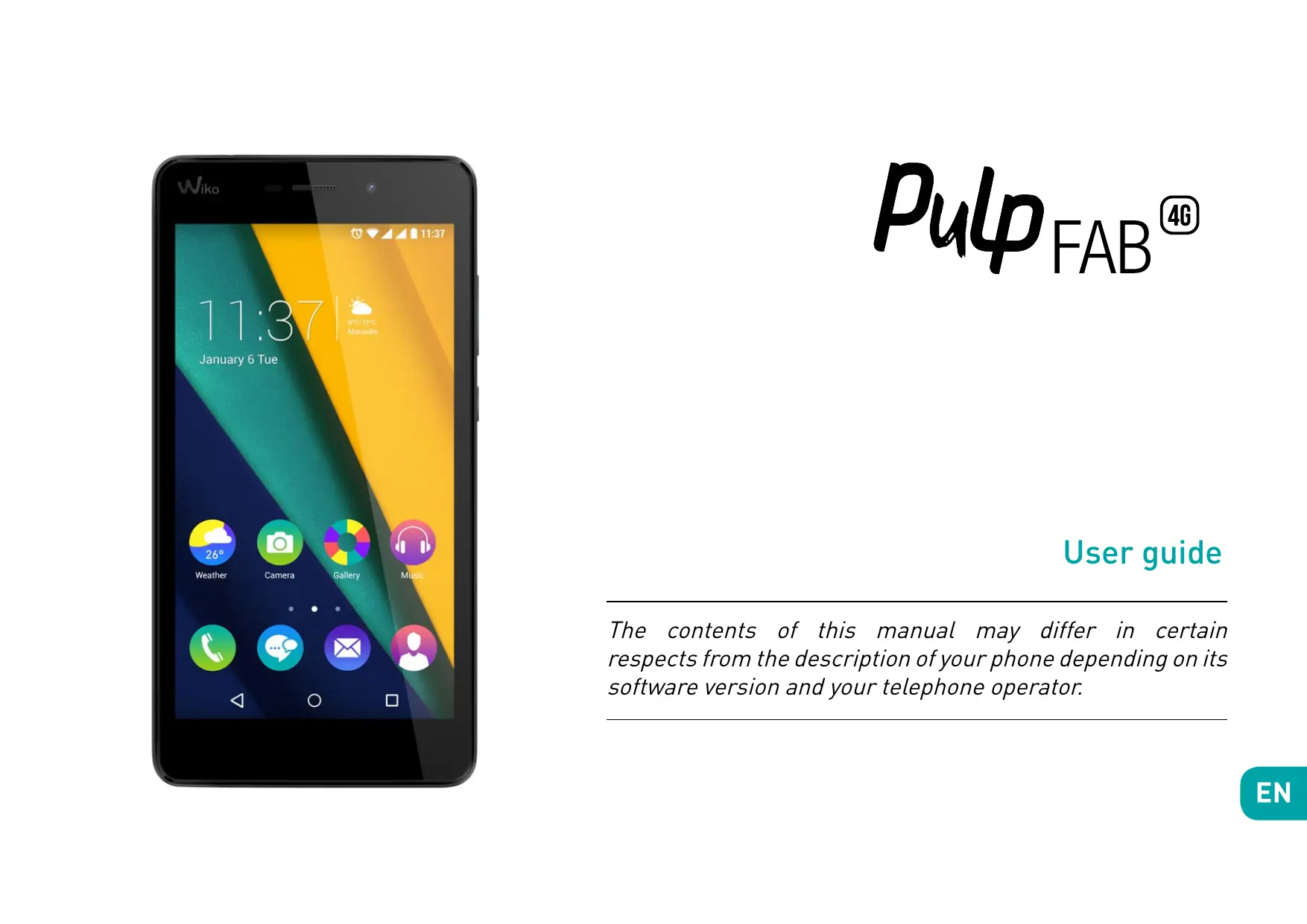User guide The contents of this manual may differ in certain respects from the description of your phone depending on its software version and your telephone operator. CONGRATULATIONS ! You have just purchased your WIKO PULP FAB 4G mobile phone. This guide contains all the information needed to use the phone so that you can quickly familiarise yourself, we hope, with the world of WIKO. information and recommendations contained herein do not constitute a guarantee under the Applicable law. WIKO reserves the right to change or modify the information contained in this manual at any time. Copyright © 2015 WIKO The information contained in this manual may not be disclosed to third parties or reproduced in any form whatsoever without the express written consent of WIKO. Limitation of Liability All content and services accessible through this device are the exclusive property of third parties and are protected by the relevant laws (copyright, patent, licence and/or other intellectual property laws). These services are for your own personal noncommercial use. It is not permitted to use any content or services without prior written permission of the content owner. You may not copy, publish, transfer, sell, create derivative works or exploit in any manner or medium any content or services displayed through this device. Trademarks WIKO is a registered trademark of WIKO SAS. Disclaimer This manual has been prepared with the utmost care and attention and is designed to guide you through the functions and features of your device. However, the