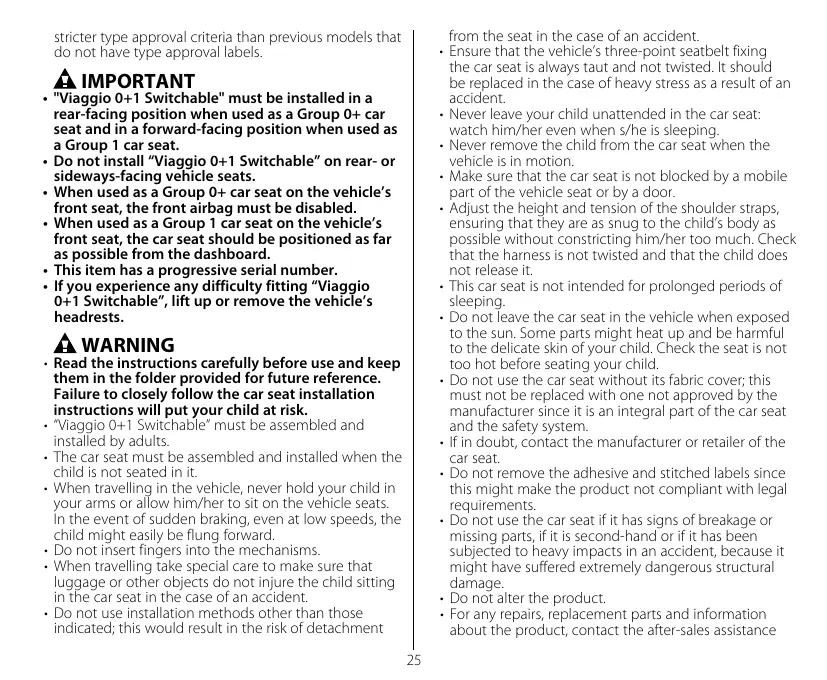 • Do not install “Viaggio 0+1 Switchable” on rear- or sideways-facing vehicle seats. • When used as a Group 0+ car seat on the vehicle’s front seat, the front airbag must be disabled. • When used as a Group 1 car seat on the vehicle’s front seat, the car seat should be positioned as far as possible from the dashboard. • This item has a progressive serial number. • If you experience any difficulty fitting “Viaggio 0+1 Switchable”, lift up or remove the vehicle’s headrests.