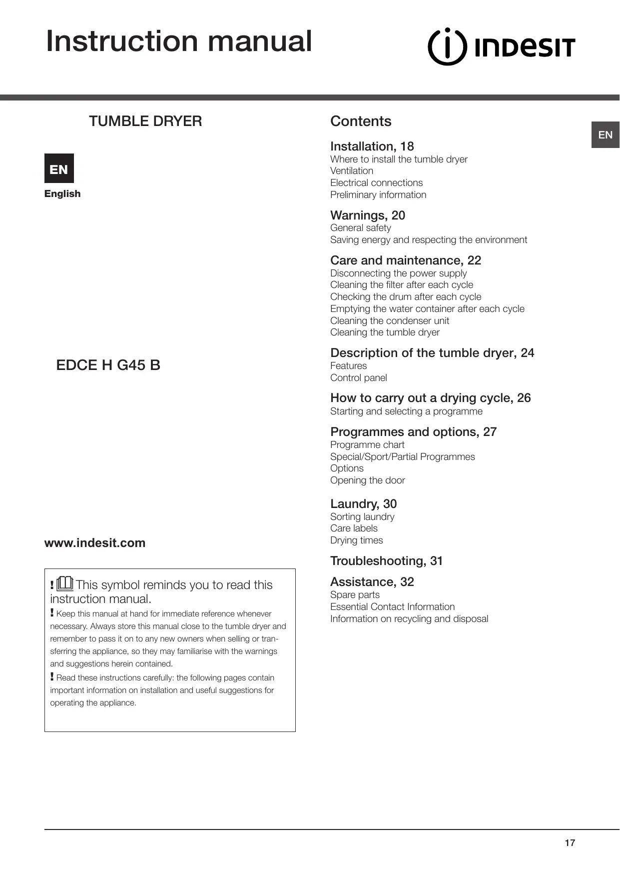 EDCEH G45 B - Tumble drier INDESIT - Free user manual and instructions