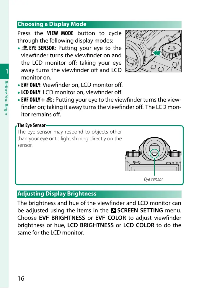 Choosing a Display Mode Press the VIEW MODE button to cycle through the following display modes: • E EYE SENSOR: Putting your eye to the viewfinder turns the viewfinder on and the LCD monitor off ; taking your eye away turns the viewfinder off and LCD monitor on. • EVF ONLY: Viewfinder on, LCD monitor off. • LCD ONLY: LCD monitor on, viewfinder off. • EVF ONLY + E: Putting your eye to the viewfinder turns the viewfinder on; taking it away turns the viewfinder off. The LCD monitor remains off. The Eye Sensor The eye sensor may respond to objects other than your eye or to light shining directly on the sensor.