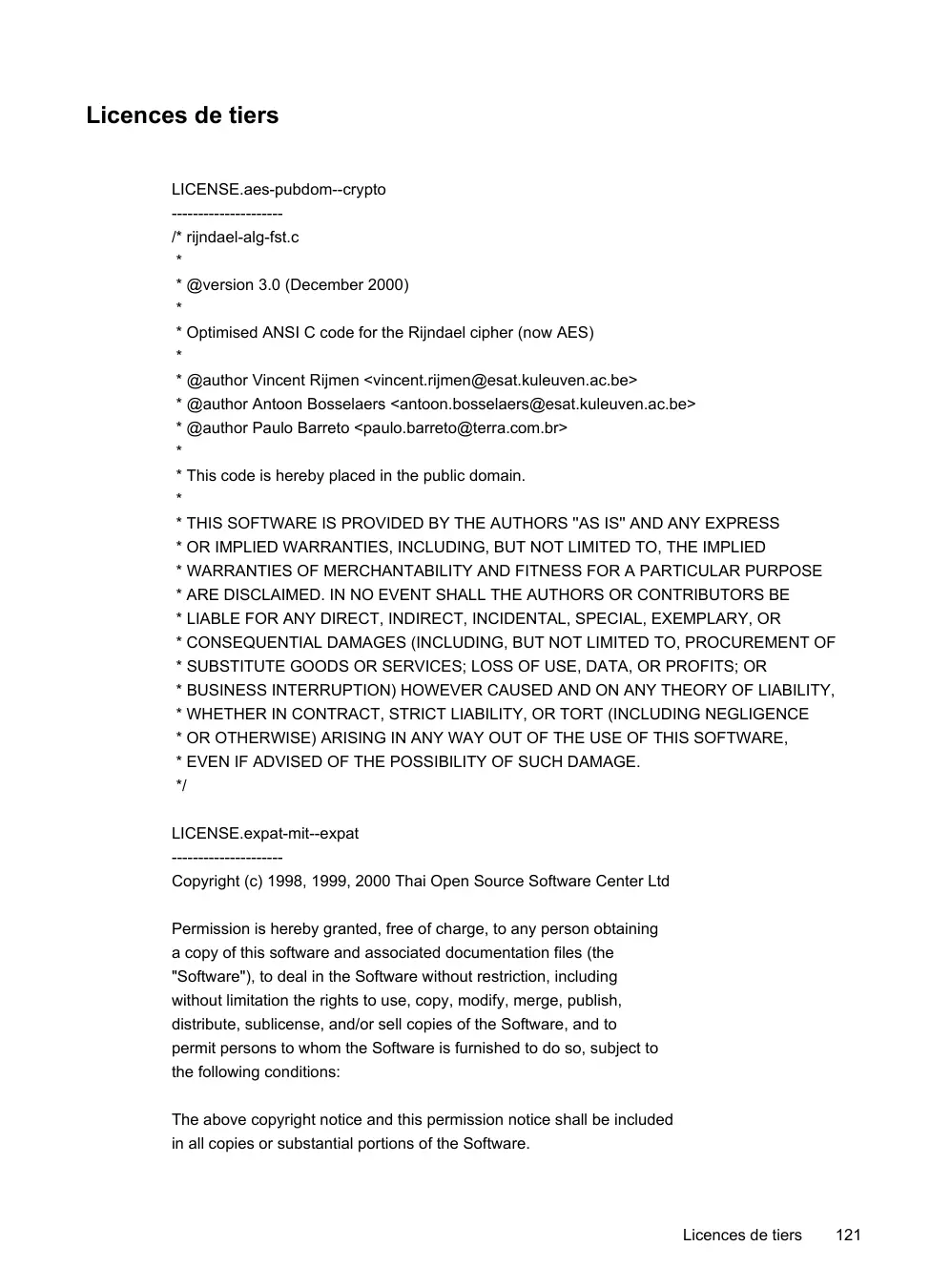 Licences de tiers LICENSE.aes-pubdom--crypto --------------------/* rijndael-alg-fst.c * * @version 3.0 (December 2000) * * Optimised ANSI C code for the Rijndael cipher (now AES) * * @author Vincent Rijmen <vincent.rijmen@esat.kuleuven.ac.be> * @author Antoon Bosselaers <antoon.bosselaers@esat.kuleuven.ac.be> * @author Paulo Barreto <paulo.barreto@terra.com.br> * * This code is hereby placed in the public domain. * * THIS SOFTWARE IS PROVIDED BY THE AUTHORS ''AS IS'' AND ANY EXPRESS * OR IMPLIED WARRANTIES, INCLUDING, BUT NOT LIMITED TO, THE IMPLIED * WARRANTIES OF MERCHANTABILITY AND FITNESS FOR A PARTICULAR PURPOSE * ARE DISCLAIMED. IN NO EVENT SHALL THE AUTHORS OR CONTRIBUTORS BE * LIABLE FOR ANY DIRECT, INDIRECT, INCIDENTAL, SPECIAL, EXEMPLARY, OR * CONSEQUENTIAL DAMAGES (INCLUDING, BUT NOT LIMITED TO, PROCUREMENT OF * SUBSTITUTE GOODS OR SERVICES; LOSS OF USE, DATA, OR PROFITS; OR * BUSINESS INTERRUPTION) HOWEVER CAUSED AND ON ANY THEORY OF LIABILITY, * WHETHER IN CONTRACT, STRICT LIABILITY, OR TORT (INCLUDING NEGLIGENCE * OR OTHERWISE) ARISING IN ANY WAY OUT OF THE USE OF THIS SOFTWARE, * EVEN IF ADVISED OF THE POSSIBILITY OF SUCH DAMAGE. */ LICENSE.expat-mit--expat --------------------Copyright (c) 1998, 1999, 2000 Thai Open Source Software Center Ltd Permission is hereby granted, free of charge, to any person obtaining a copy of this software and associated documentation files (the "Software"), to deal in the Software without restriction, including without limitation the rights to use, copy, modify, merge, publish, distribute, sublicense, and/or sell copies of the Software, and to permit persons to whom the Software is furnished to do so, subject to the following conditions: The above copyright notice and this permission notice shall be included in all copies or substantial portions of the Software.