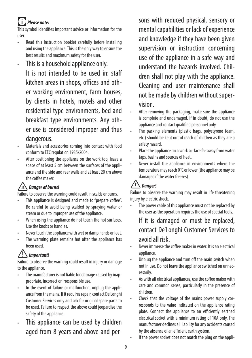 Failure to observe the warning could result in injury or damage to the appliance. • The manufacturer is not liable for damage caused by inappropriate, incorrect or irresponsible use. • In the event of failure or malfunction, unplug the appliance from the mains. If it requires repair, contact De’Longhi Customer Services only and ask for original spare parts to be used. Failure to respect the above could jeopardise the safety of the appliance. •