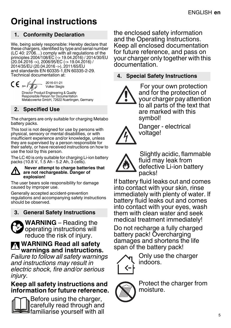 The chargers are only suitable for charging Metabo battery packs. This tool is not designed for use by persons with physical, sensory or mental disabilities, or with insufficient experience and/or knowledge, unless they are supervised by a person responsible for their safety, or have received instructions on how to use the tool by this person. The LC 40 is only suitable for charging Li-ion battery packs (10.8 V, 1.5 Ah - 5.2 Ah, 3 cells). Never attempt to charge batteries that are not rechargeable. Danger of explosion! The user bears sole responsibility for damage caused by improper use. Generally accepted accident-prevention regulations and accompanying safety instructions should be observed.