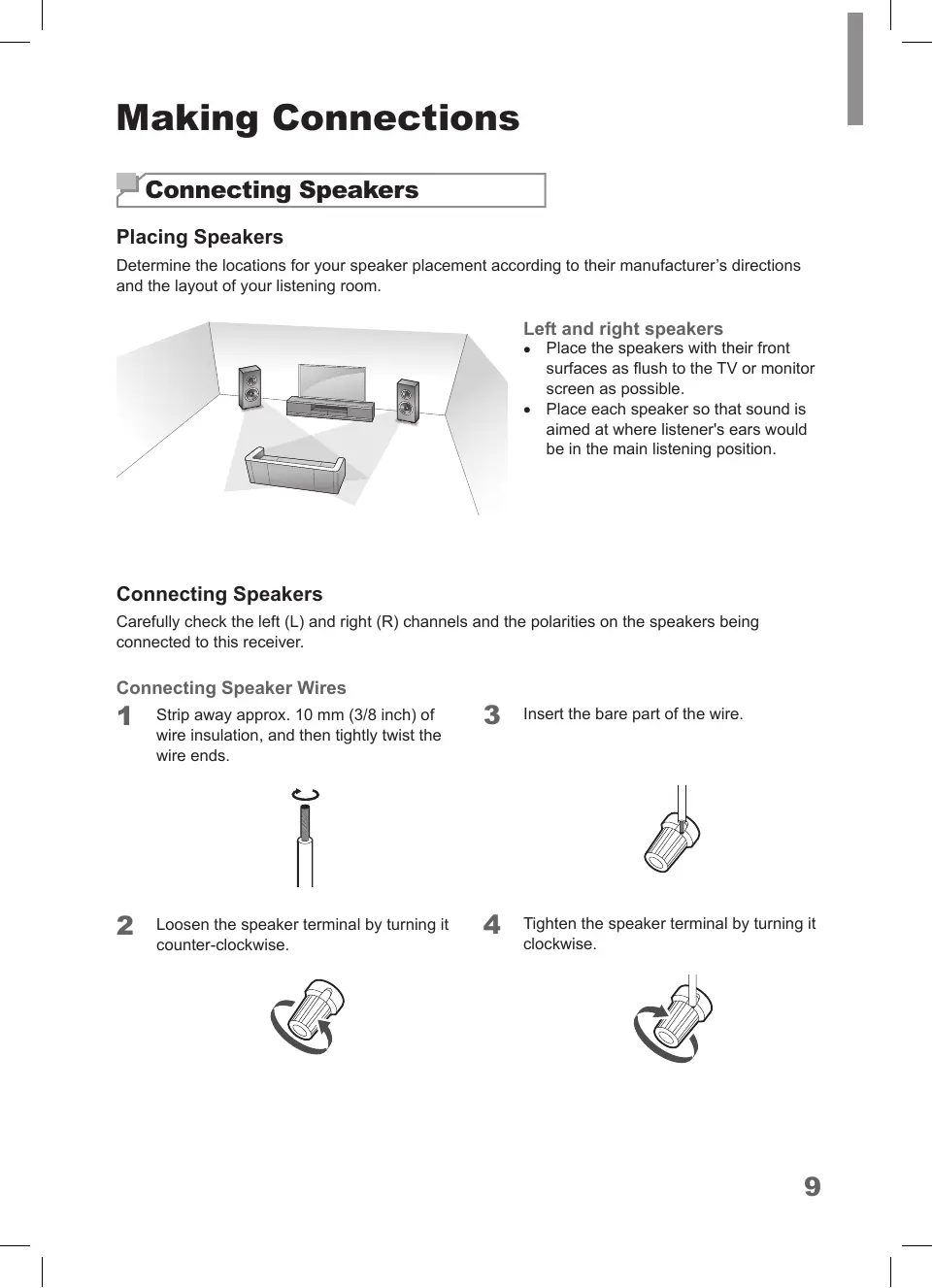 - • Place each speaker so that sound is aimed at where listener's ears would be in the main listening position. Connecting Speakers Carefully check the left (L) and right (R) channels and the polarities on the speakers being connected to this receiver. Connecting Speaker Wires