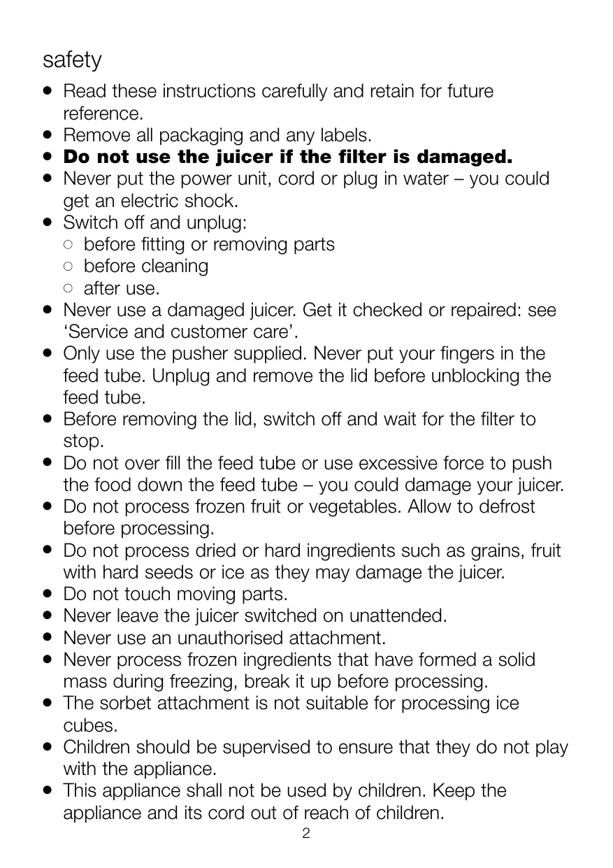 Read these instructions carefully and retain for future reference. Remove all packaging and any labels. Do not use the juicer if the filter is damaged. Never put the power unit, cord or plug in water – you could get an electric shock. Switch off and unplug: before fitting or removing parts before cleaning after use. Never use a damaged juicer. Get it checked or repaired: see ‘Service and customer care’. Only use the pusher supplied. Never put your fingers in the feed tube. Unplug and remove the lid before unblocking the feed tube. Before removing the lid, switch off and wait for the filter to stop. Do not over fill the feed tube or use excessive force to push the food down the feed tube – you could damage your juicer. Do not process frozen fruit or vegetables. Allow to defrost before processing. Do not process dried or hard ingredients such as grains, fruit with hard seeds or ice as they may damage the juicer. Do not touch moving parts. Never leave the juicer switched on unattended. Never use an unauthorised attachment. Never process frozen ingredients that have formed a solid mass during freezing, break it up before processing. The sorbet attachment is not suitable for processing ice cubes. Children should be supervised to ensure that they do not play with the appliance. This appliance shall not be used by children. Keep the appliance and its cord out of reach of children. 2