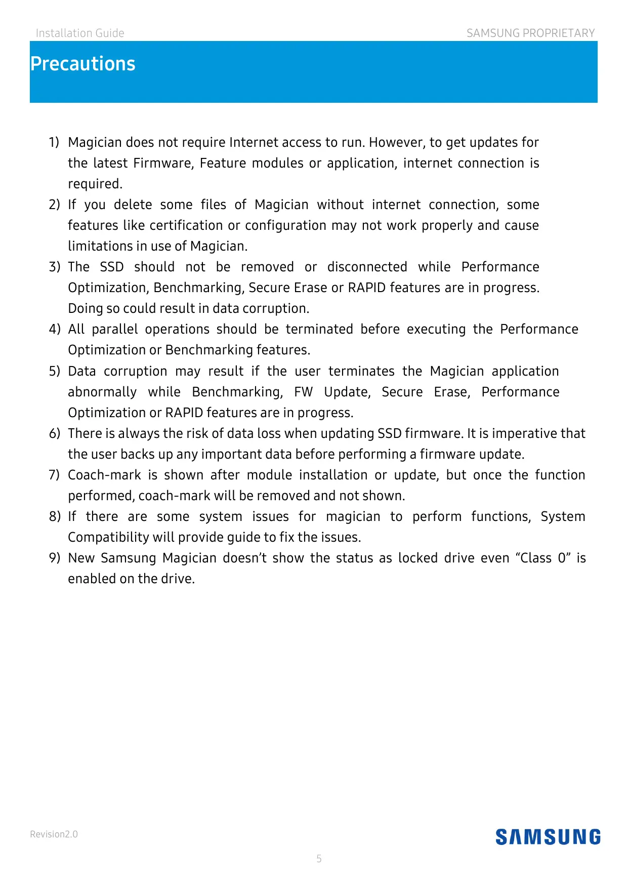 Installation Guide SAMSUNG PROPRIETARY Introduction New Samsung Magician Samsung Magician software, up until the version 4.9.7, has been an end-user application with a collection of features to help manage Samsung branded SSDs. With New Samsung Magician, it is aimed at providing a better user experience with a new GUI, feature-level update schemes. Samsung Magician software is developed and distributed exclusively for owners of Samsung Solid Sate Drives (SSDs). New Features New Samsung Magician features a number of improvements over version 4.9.7: