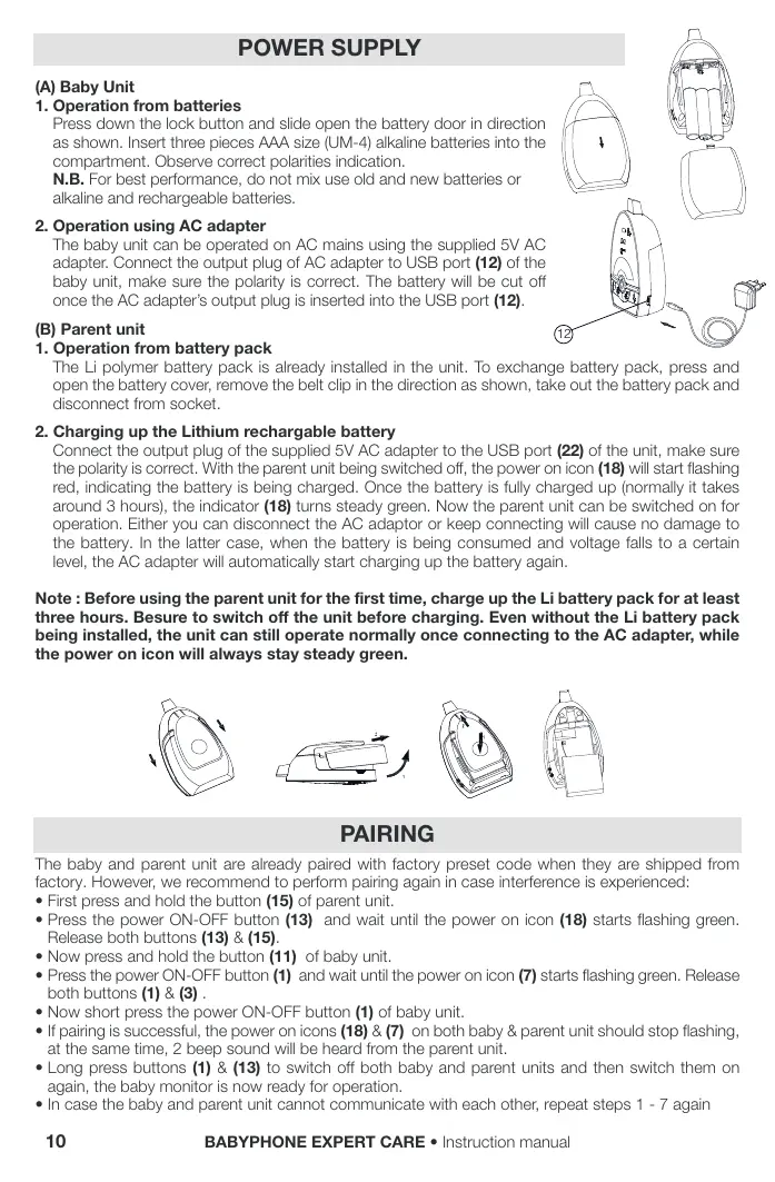 (A) Baby Unit 1. Operation from batteries Press down the lock button and slide open the battery door in direction as shown. Insert three pieces AAA size (UM-4) alkaline batteries into the compartment. Observe correct polarities indication. N.B. For best performance, do not mix use old and new batteries or alkaline and rechargeable batteries. 2. Operation using AC adapter The baby unit can be operated on AC mains using the supplied 5V AC adapter. Connect the output plug of AC adapter to USB port (12) of the baby unit, make sure the polarity is correct. The battery will be cut off once the AC adapter’s output plug is inserted into the USB port (12). (B) Parent unit 12 1. Operation from battery pack The Li polymer battery pack is already installed in the unit. To exchange battery pack, press and open the battery cover, remove the belt clip in the direction as shown, take out the battery pack and disconnect from socket. 2. Charging up the Lithium rechargable battery Connect the output plug of the supplied 5V AC adapter to the USB port (22) of the unit, make sure the polarity is correct. With the parent unit being switched off, the power on icon (18) will start flashing red, indicating the battery is being charged. Once the battery is fully charged up (normally it takes around 3 hours), the indicator (18) turns steady green. Now the parent unit can be switched on for operation. Either you can disconnect the AC adaptor or keep connecting will cause no damage to the battery. In the latter case, when the battery is being consumed and voltage falls to a certain level, the AC adapter will automatically start charging up the battery again. Note : Before using the parent unit for the first time, charge up the Li battery pack for at least three hours. Besure to switch off the unit before charging. Even without the Li battery pack being installed, the unit can still operate normally once connecting to the AC adapter, while the power on icon will always stay steady green.