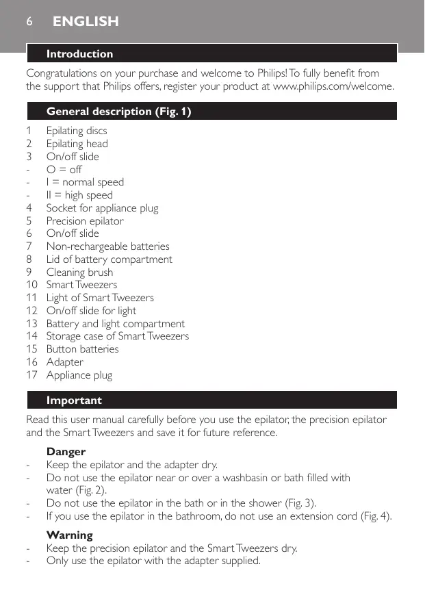 Epilating discs Epilating head On/off slide O = off I = normal speed II = high speed Socket for appliance plug Precision epilator On/off slide Non-rechargeable batteries Lid of battery compartment Cleaning brush Smart Tweezers Light of Smart Tweezers On/off slide for light Battery and light compartment Storage case of Smart Tweezers Button batteries Adapter Appliance plug Important Read this user manual carefully before you use the epilator, the precision epilator and the Smart Tweezers and save it for future reference.