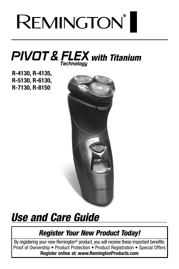 with Titanium R-4130, R-4135, R-5130, R-6130, R-7130, R-8150 Use and Care Guide Register Your New Product Today! By registering your new Remington® product, you will receive these important benefits: Proof of Ownership • Product Protection • Product Registration • Special Offers Register online at: www.RemingtonProducts.com IMPORTANT SAFETY INSTRUCTIONS Save these Instructions When using an electrical appliance, basic precautions should always be observed, including the following. Read all instructions before using this shaver. DANGER TO REDUCE THE RISK OF FIRE OR ELECTRIC SHOCK, CAREFULLY FOLLOW THESE INSTRUCTIONS: ■ For connection of the power supply unit to a power source not in the U.S.A. and Canada, use an attachment plug adaptor of the proper configuration for the power outlet. ■ Do not reach for an appliance that has fallen into water. Unplug it immediately. ■ Do not use while bathing or in the shower. ■ Use only when the shaver is in dry condition. ■ Detach the appliance from the power supply cord before cleaning. ■ Do not submerge in water. ■ Do not place or store this appliance where it can fall or be pulled into a tub or sink. Do not place or drop into water or other liquid. ■ Except when charging, always unplug this appliance from the electrical outlet immediately after using. ■ Unplug this appliance before cleaning. WARNING To reduce the risk of burns, fire, electric shock, or injury to persons: ■ An appliance should never be left unattended when it’s plugged in, except when charging a rechargeable appliance. ■ Close supervision is necessary when this appliance is used by, on, or near children, or individuals with certain disabilities or special needs.