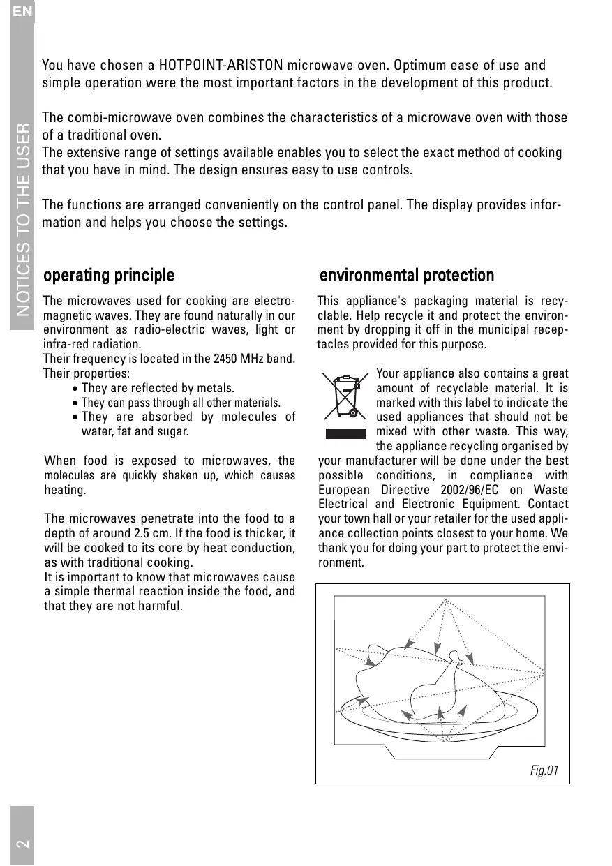 EN NOTICES TO THE USER You have chosen a HOTPOINT-ARISTON microwave oven. Optimum ease of use and simple operation were the most important factors in the development of this product. The combi-microwave oven combines the characteristics of a microwave oven with those of a traditional oven. The extensive range of settings available enables you to select the exact method of cooking that you have in mind. The design ensures easy to use controls. The functions are arranged conveniently on the control panel. The display provides information and helps you choose the settings.