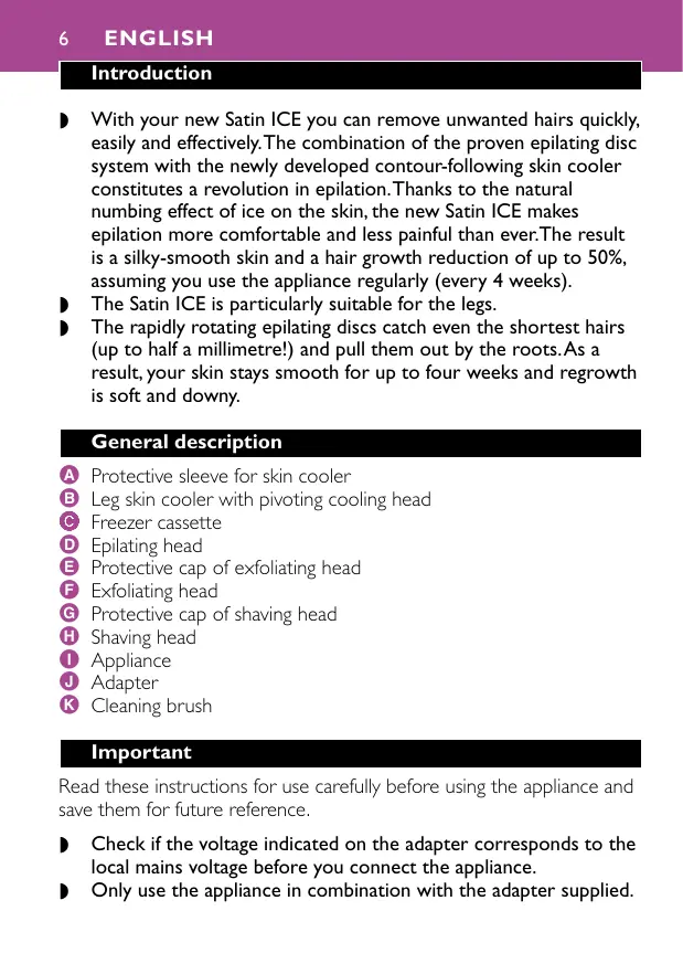 Protective sleeve for skin cooler Leg skin cooler with pivoting cooling head Freezer cassette Epilating head Protective cap of exfoliating head Exfoliating head Protective cap of shaving head Shaving head Appliance Adapter Cleaning brush Important Read these instructions for use carefully before using the appliance and save them for future reference.