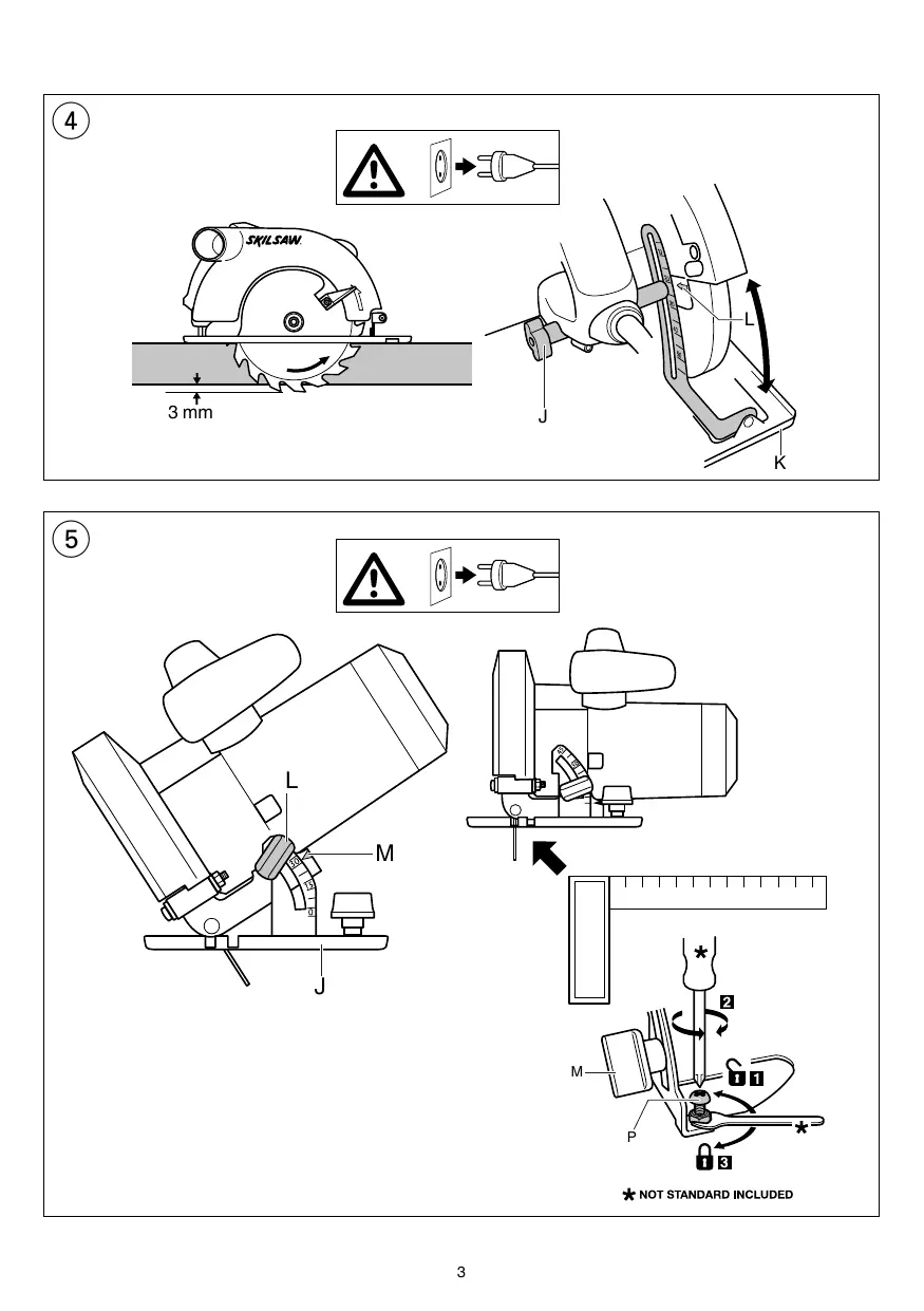 ! disconnect the plug - take hex key A from storage B - push spindle-lock button C and hold it while you remove blade bolt D with hex key ! push spindle-lock button C only when tool is at a standstill - release spindle-lock button C - remove flange E - open lower guard F with lever G and hold it while you mount saw blade with saw teeth and arrow printed on saw blade pointing in same direction as arrow on upper guard - release lower guard F - mount flange E ! make sure that clamping surfaces H of flanges are perfectly clean and face the blade - push spindle-lock button C and hold it while you tighten blade bolt with hex key 1/8 turn past finger tight (ensures slippage of saw blade when it encounters excessive resistance thus reducing motor overload and saw kickback) - release spindle-lock button C • Adjusting cutting depth (0-55 mm) 4 - for an optimal quality cut the saw blade should not extend more than 3 mm below the workpiece - loosen knob J - raise/lower foot K until desired cutting depth is set on scale using indicator L - tighten knob J • Adjusting cutting angle (0-45°) 5 - loosen knob M - tilt tool until desired cutting angle is set on scale using indicator N - tighten knob M ! when bevel cutting, cutting depth does not correspond with value on cutting depth scale • 90° Cutting angle check 5 - adjust and tighten foot K to maximum cutting depth 4 - adjust and tighten cutting angle to 0° - check for a 90° angle between the blade and bottom of foot with a square - if adjustment is needed, loosen knob M and use adjustment screw P as illustrated • Adjustable saw line visor Q 6a - for guiding tool along desired line of cut marked on the workpiece - for a straight 0° cut or a 45° bevel cut use the indicator line concerned