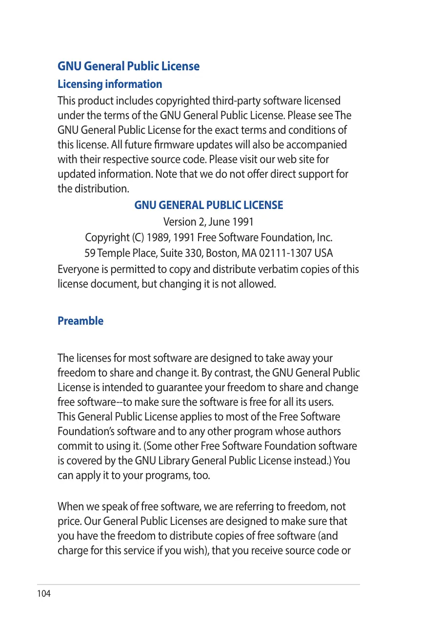 GNU General Public License Licensing information This product includes copyrighted third-party software licensed under the terms of the GNU General Public License. Please see The GNU General Public License for the exact terms and conditions of this license. All future firmware updates will also be accompanied with their respective source code. Please visit our web site for updated information. Note that we do not offer direct support for the distribution.