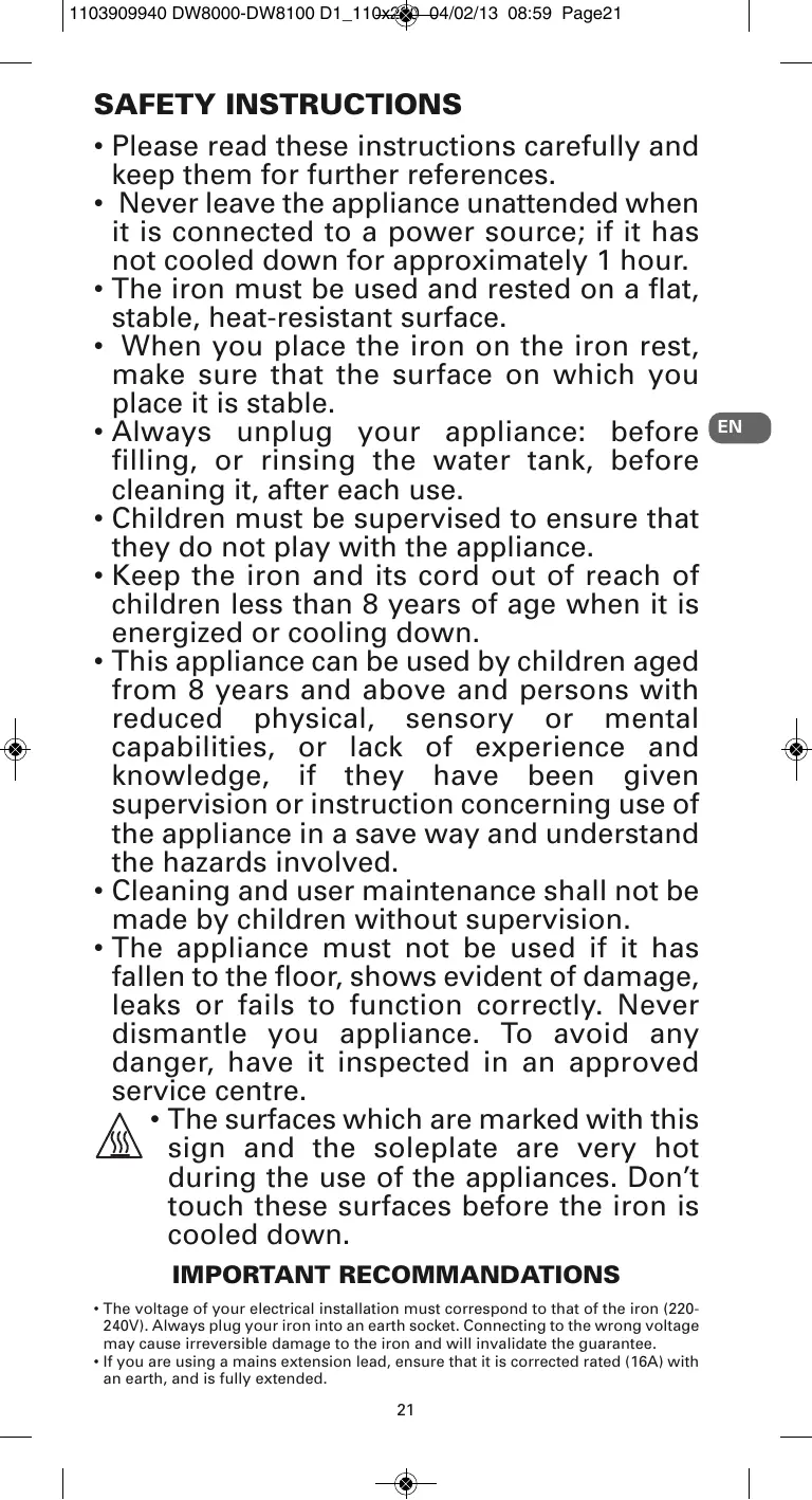 • Please read these instructions carefully and keep them for further references. • Never leave the appliance unattended when it is connected to a power source; if it has not cooled down for approximately 1 hour. • The iron must be used and rested on a flat, stable, heat-resistant surface. • When you place the iron on the iron rest, make sure that the surface on which you place it is stable. • Always unplug your appliance: before filling, or rinsing the water tank, before cleaning it, after each use. • Children must be supervised to ensure that they do not play with the appliance. • Keep the iron and its cord out of reach of children less than 8 years of age when it is energized or cooling down. • This appliance can be used by children aged from 8 years and above and persons with reduced physical, sensory or mental capabilities, or lack of experience and knowledge, if they have been given supervision or instruction concerning use of the appliance in a save way and understand the hazards involved. • Cleaning and user maintenance shall not be made by children without supervision. • The appliance must not be used if it has fallen to the floor, shows evident of damage, leaks or fails to function correctly. Never dismantle you appliance. To avoid any danger, have it inspected in an approved service centre. • The surfaces which are marked with this sign and the soleplate are very hot during the use of the appliances. Don’t touch these surfaces before the iron is cooled down. IMPORTANT RECOMMANDATIONS • The voltage of your electrical installation must correspond to that of the iron (220240V). Always plug your iron into an earth socket. Connecting to the wrong voltage may cause irreversible damage to the iron and will invalidate the guarantee. • If you are using a mains extension lead, ensure that it is corrected rated (16A) with an earth, and is fully extended.
