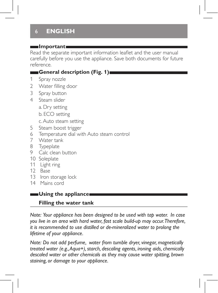 Read the separate important information leaflet and the user manual carefully before you use the appliance. Save both documents for future reference. General description (Fig. 1) 1 Spray nozzle 2 Water filling door 3 Spray button 4 Steam slider a. Dry setting b. ECO setting c. Auto steam setting 5 Steam boost trigger 6 Temperature dial with Auto steam control 7 Water tank 8 Typeplate 9 Calc clean button 10 Soleplate 11 Light ring 12 Base 13 Iron storage lock 14 Mains cord Using the appliance Filling the water tank Note: Your appliance has been designed to be used with tap water. In case you live in an area with hard water, fast scale build-up may occur.Therefore, it is recommended to use distilled or de-mineralized water to prolong the lifetime of your appliance. Note: Do not add perfume, water from tumble dryer, vinegar, magnetically treated water (e.g., Aqua+), starch, descaling agents, ironing aids, chemically descaled water or other chemicals as they may cause water spitting, brown staining, or damage to your appliance.