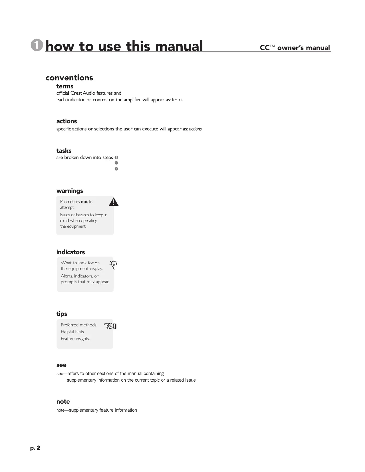 Download the instructions for your Power Amplifiers in PDF format for free! Find your manual CC SERIES - CREST AUDIO and take your electronic device back in hand. On this page are published all the documents necessary for the use of your device. CC SERIES by CREST AUDIO.