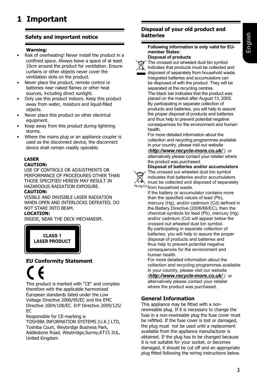 Warning: Risk of overheating! Never install the product in a confined space. Always leave a space of at least 10cm around the product for ventilation. Ensure curtains or other objects never cover the ventilation slots on the product. Never place the product, remote control or batteries near naked flames or other heat sources, including direct sunlight. Only use this product indoors. Keep this product away from water, moisture and liquid-filled objects. Never place this product on other electrical equipment. Keep away from this product during lightning storms. Where the mains plug or an appliance coupler is used as the disconnect device, the disconnect device shall remain readily operable. LASER CAUTION: USE OF CONTROLS OR ADJUSTMENTS OR PERFORMANCE OF PROCEDURES OTHER THAN THOSE SPECIFIED HEREIN MAY RESULT IN HAZARDOUS RADIATION EXPOSURE. CAUTION: VISIBLE AND INVISIBLE LASER RADIATION WHEN OPEN AND INTERLOCKS DEFEATED. DO NOT STARE INTO BEAM. LOCATION: INSIDE, NEAR THE DECK MECHANISM.