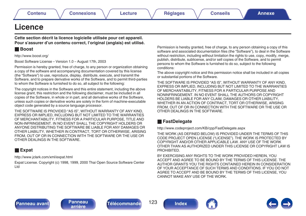 Index Conseils Annexe Contenu Connexions Lecture Réglages Conseils Annexe Licence Cette section décrit la licence logicielle utilisée pour cet appareil. Pour s’assurer d’un contenu correct, l’original (anglais) est utilisé. Permission is hereby granted, free of charge, to any person obtaining a copy of this software and associated documentation files (the “Software”), to deal in the Software without restriction, including without limitation the rights to use, copy, modify, merge, publish, distribute, sublicense, and/or sell copies of the Software, and to permit persons to whom the Software is furnished to do so, subject to the following conditions: The above copyright notice and this permission notice shall be included in all copies or substantial portions of the Software. o Boost http://www.boost.org/ Boost Software License – Version 1.0 – August 17th, 2003 Permission is hereby granted, free of charge, to any person or organization obtaining a copy of the software and accompanying documentation covered by this license (the “Software”) to use, reproduce, display, distribute, execute, and transmit the Software, and to prepare derivative works of the Software, and to permit third-parties to whom the Software is furnished to do so, all subject to the following: THE SOFTWARE IS PROVIDED “AS IS”, WITHOUT WARRANTY OF ANY KIND, EXPRESS OR IMPLIED, INCLUDING BUT NOT LIMITED TO THE WARRANTIES OF MERCHANTABILITY, FITNESS FOR A PARTICULAR PURPOSE AND NONINFRINGEMENT. IN NO EVENT SHALL THE AUTHORS OR COPYRIGHT HOLDERS BE LIABLE FOR ANY CLAIM, DAMAGES OR OTHER LIABILITY, WHETHER IN AN ACTION OF CONTRACT, TORT OR OTHERWISE, ARISING FROM, OUT OF OR IN CONNECTION WITH THE SOFTWARE OR THE USE OR OTHER DEALINGS IN THE SOFTWARE. The copyright notices in the Software and this entire statement, including the above license grant, this restriction and the following disclaimer, must be included in all copies of the Software, in whole or in part, and all derivative works of the Software, unless such copies or derivative works are solely in the form of machine-executable object code generated by a source language processor. THE SOFTWARE IS PROVIDED “AS IS”, WITHOUT WARRANTY OF ANY KIND, EXPRESS OR IMPLIED, INCLUDING BUT NOT LIMITED TO THE WARRANTIES OF MERCHANTABILITY, FITNESS FOR A PARTICULAR PURPOSE, TITLE AND NON-INFRINGEMENT. IN NO EVENT SHALL THE COPYRIGHT HOLDERS OR ANYONE DISTRIBUTING THE SOFTWARE BE LIABLE FOR ANY DAMAGES OR OTHER LIABILITY, WHETHER IN CONTRACT, TORT OR OTHERWISE, ARISING FROM, OUT OF OR IN CONNECTION WITH THE SOFTWARE OR THE USE OR OTHER DEALINGS IN THE SOFTWARE. o FastDelegate http://www.codeproject.com/KB/cpp/FastDelegate.aspx THE WORK (AS DEFINED BELOW) IS PROVIDED UNDER THE TERMS OF THIS CODE PROJECT OPEN LICENSE (“LICENSE”). THE WORK IS PROTECTED BY COPYRIGHT AND/OR OTHER APPLICABLE LAW. ANY USE OF THE WORK OTHER THAN AS AUTHORIZED UNDER THIS LICENSE OR COPYRIGHT LAW IS PROHIBITED. o Expat BY EXERCISING ANY RIGHTS TO THE WORK PROVIDED HEREIN, YOU ACCEPT AND AGREE TO BE BOUND BY THE TERMS OF THIS LICENSE. THE AUTHOR GRANTS YOU THE RIGHTS CONTAINED HEREIN IN CONSIDERATION OF YOUR ACCEPTANCE OF SUCH TERMS AND CONDITIONS. IF YOU DO NOT AGREE TO ACCEPT AND BE BOUND BY THE TERMS OF THIS LICENSE, YOU CANNOT MAKE ANY USE OF THE WORK. http://www.jclark.com/xml/expat.html Expat License. Copyright (c) 1998, 1999, 2000 Thai Open Source Software Center Ltd Panneau avant Panneau arrière Télécommande