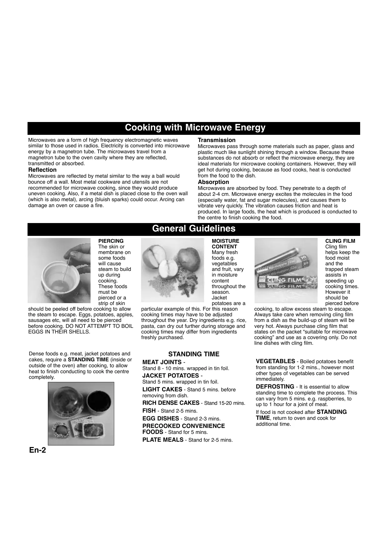 DEFROSTING - It is essential to allow standing time to complete the process. This can vary from 5 mins. e.g. raspberries, to up to 1 hour for a joint of meat. If food is not cooked after STANDING TIME, return to oven and cook for additional time.