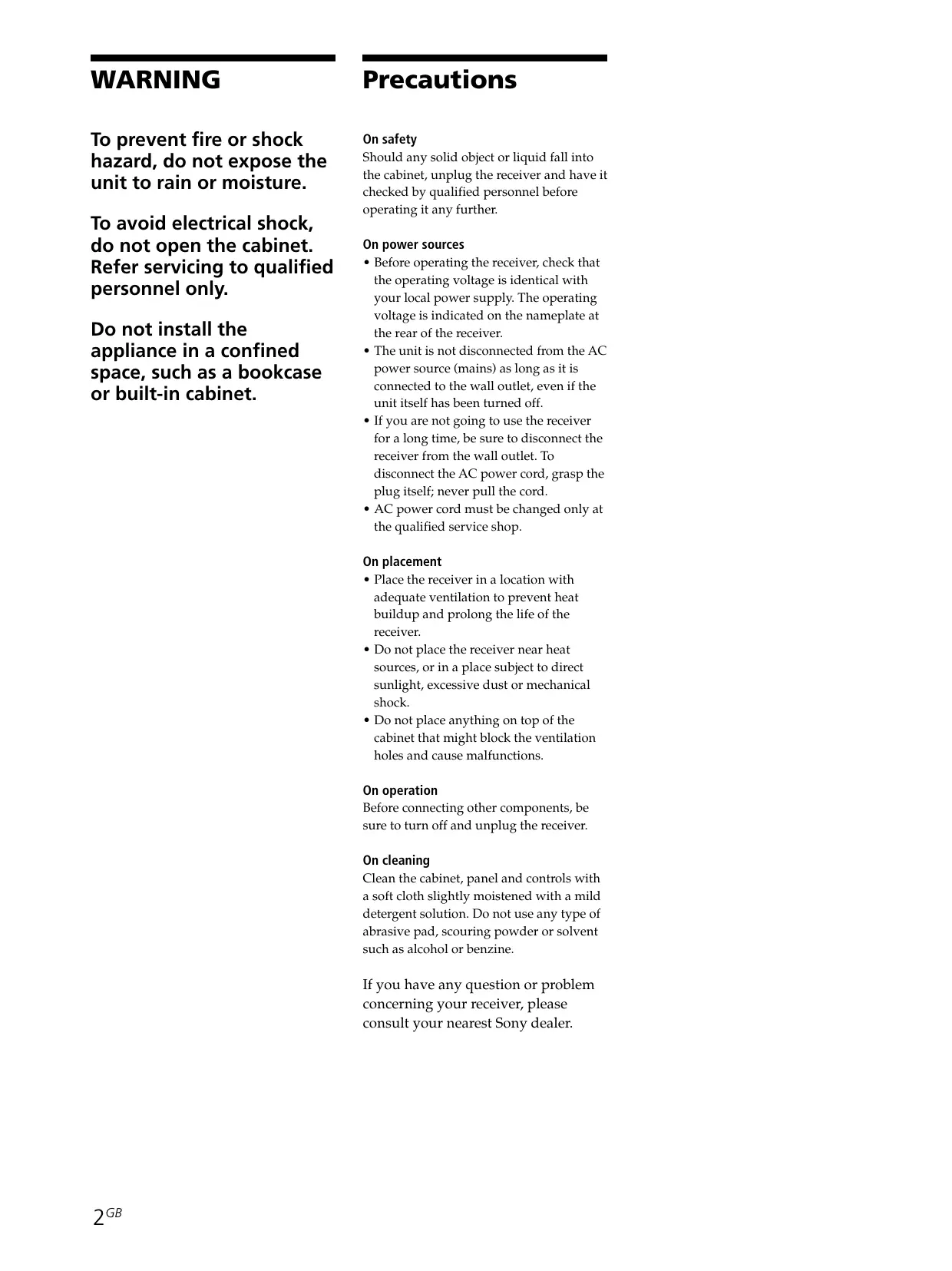 If you have any question or problem concerning your receiver, please consult your nearest Sony dealer.