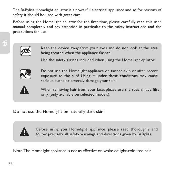 Avoid exposing yourself to sunlight for 4 weeks before treatment with the Homelight epilator, and for 2 weeks following treatment. 2.3. DO NOT USE the Homelight epilator near your eyes. Pointing the BaByliss Homelight appliance at your eyes when activated can cause serious eye damage. The appliance is not intended for removing hair from eyelashes or eyebrows. Keep away from your eyes! Use the safety glasses included when using the Homelight epilator. 2.4. DO NOT USE the epilator on white, grey or blond hair. The Homelight appliance is not effective on white, grey or blond hair. If your hair is one of these colours, the Homelight appliance may not work. Note: the colour of the hair may also differ according to the different areas of the body. It is possible that the results will vary depending on the area treated and the hair colour.
