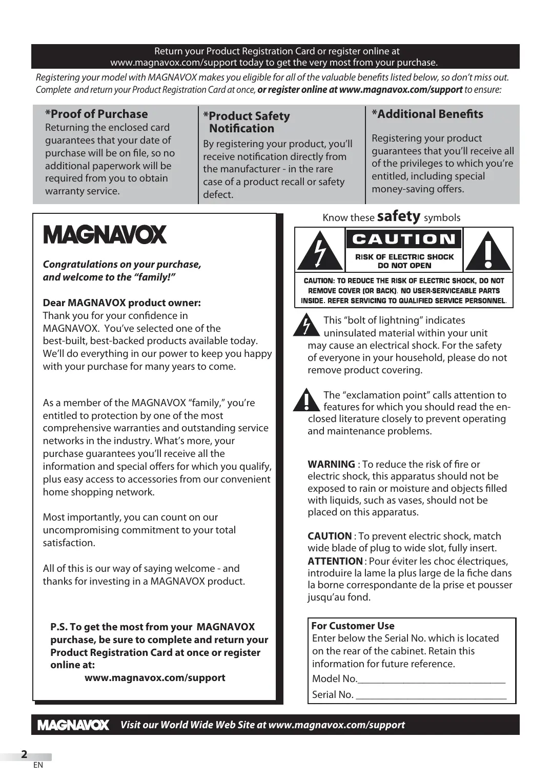 P.S. To get the most from your MAGNAVOX purchase, be sure to complete and return your Product Registration Card at once or register online at: