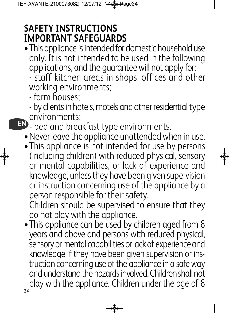 SAFETY INSTRUCTIONS IMPORTANT SAFEGUARDS •This appliance is intended for domestic household use only. It is not intended to be used in the following applications, and the guarantee will not apply for: - staff kitchen areas in shops, offices and other working environments; - farm houses; - by clients in hotels, motels and other residential type environments; EN - bed and breakfast type environments. •Never leave the appliance unattended when in use. •This appliance is not intended for use by persons (including children) with reduced physical, sensory or mental capabilities, or lack of experience and knowledge, unless they have been given supervision or instruction concerning use of the appliance by a person responsible for their safety. Children should be supervised to ensure that they do not play with the appliance. •This appliance can be used by children aged from 8 years and above and persons with reduced physical, sensory or mental capabilities or lack of experience and knowledge if they have been given supervision or instruction concerning use of the appliance in a safe way and understand the hazards involved. Children shall not play with the appliance. Children under the age of 8 34
