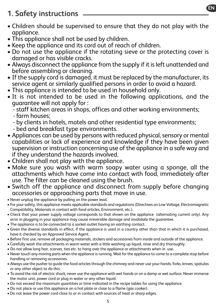 • This appliance shall not be used by children. • Keep the appliance and its cord out of reach of children. • Do not use the appliance if the rotating sieve or the protecting cover is damaged or has visible cracks. • Always disconnect the appliance from the supply if it is left unattended and before assembling or cleaning. • If the supply cord is damaged, it must be replaced by the manufacturer, its service agent or similarly qualified persons in order to avoid a hazard. • This appliance is intended to be used in household only. • It is not intended to be used in the following applications, and the guarantee will not apply for : - staff kitchen areas in shops, offices and other working environments; - farm houses; - by clients in hotels, motels and other residential type environments; - bed and breakfast type environments. • Appliances can be used by persons with reduced physical, sensory or mental capabilities or lack of experience and knowledge if they have been given supervision or instruction concerning use of the appliance in a safe way and if they understand the hazards involved. • Children shall not play with the appliance. • Make sure you wash with warm soapy water using a sponge, all the attachments which have come into contact with food, immediately after use. The filter can be cleaned using the brush. • Switch off the appliance and disconnect from supply before changing accessories or approaching parts that move in use. • Never unplug the appliance by pulling on the power lead. • For your safety, this appliance meets applicable standards and regulations (Directives on Low Voltage, Electromagnetic Compatibility, Materials in contact with food articles, Environment, etc.). • Check that your power supply voltage corresponds to that shown on the appliance (alternating current only). Any error in plugging in your appliance may cause irreversible damage and invalidate the guarantee. • The appliance is to be connected to a socket-outlet having an earthing contact. • Given the diverse standards in effect, if the appliance is used in a country other than that in which it is purchased, have it checked by an Approved Service Agent. • Before first use, remove all packaging materials, stickers and accessories from inside and outside of the appliance. • Carefully wash the attachments in warm water with a little washing up liquid, rinse and dry thoroughly. • Do not allow long hair, scarves, ties etc. to hang over the appliance or attachments when in use. • Never touch any moving parts when the appliance is running. Wait for the appliance to come to a complete stop before handling or removing accessories. • Always use the pusher to guide the food articles through the chimney and never use your hands, forks, knives, spatulas or any other object to do this. • To avoid the risk of electric shock, never use the appliance with wet hands or on a damp or wet surface. Never immerse the motor unit, power cord or plug in water or any other liquid. • Do not exceed the maximum quantities or time indicated in the recipe tables for using the appliance. • Do not place or use this appliance on a hot plate or close to a flame (gas cooker). • Do not leave the power cord close to or in contact with sources of heat or sharp edges. 5