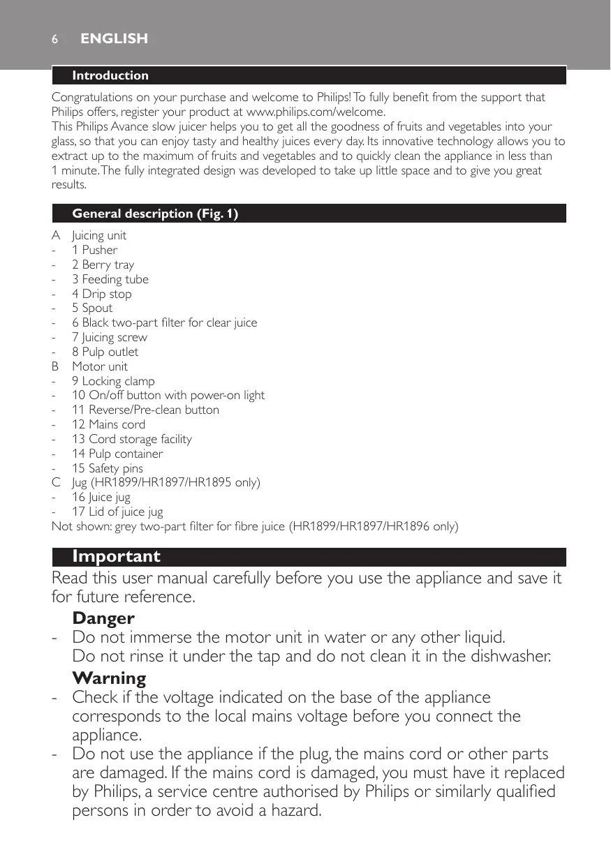 HR1899,HR1897,HR1896,HR1895,HR1894 Congratulations on your purchase and welcome to Philips! To fully benefit from the support that Philips offers, register your product at www.philips.com/welcome. This Philips Avance slow juicer helps you to get all the goodness of fruits and vegetables into your glass, so that you can enjoy tasty and healthy juices every day. Its innovative technology allows you to extract up to the maximum of fruits and vegetables and to quickly clean the appliance in less than 1 minute. The fully integrated design was developed to take up little space and to give you great results. General description (Fig. 1) A Juicing unit -- 1 Pusher -- 2 Berry tray -- 3 Feeding tube -- 4 Drip stop -- 5 Spout -- 6 Black two-part filter for clear juice -- 7 Juicing screw -- 8 Pulp outlet B Motor unit -- 9 Locking clamp -- 10 On/off button with power-on light -- 11 Reverse/Pre-clean button -- 12 Mains cord -- 13 Cord storage facility -- 14 Pulp container -- 15 Safety pins C Jug (HR1899/HR1897/HR1895 only) -- 16 Juice jug -- 17 Lid of juice jug Not shown: grey two-part filter for fibre juice (HR1899/HR1897/HR1896 only) Important Read this user manual carefully before you use the appliance and save it for future reference. Danger -- Do not immerse the motor unit in water or any other liquid. Do not rinse it under the tap and do not clean it in the dishwasher. Warning -- Check if the voltage indicated on the base of the appliance corresponds to the local mains voltage before you connect the appliance. -- Do not use the appliance if the plug, the mains cord or other parts are damaged. If the mains cord is damaged, you must have it replaced by Philips, a service centre authorised by Philips or similarly qualified persons in order to avoid a hazard. ENGLISH