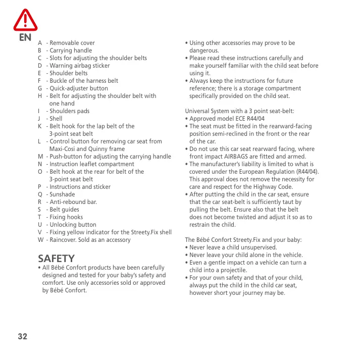 - Removable cover - Carrying handle - Slots for adjusting the shoulder belts - Warning airbag sticker - Shoulder belts - Buckle of the harness belt - Quick-adjuster button - Belt for adjusting the shoulder belt with one hand - Shoulders pads - Shell - Belt hook for the lap belt of the 3-point seat belt - Control button for removing car seat from Maxi-Cosi and Quinny frame - Push-button for adjusting the carrying handle - Instruction leaflet compartment - Belt hook at the rear for belt of the 3-point seat belt - Instructions and sticker - Sunshade - Anti-rebound bar. - Belt guides - Fixing hooks - Unlocking button - Fixing yellow indicator for the Streety.Fix shell - Raincover. Sold as an accessory SAFETY