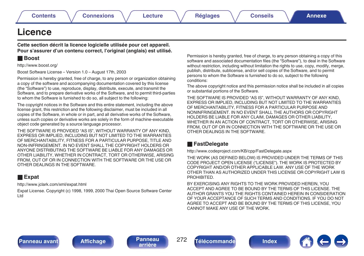 Télécommande Index Annexe Contents Connexions Lecture Réglages Conseils Annexe Licence Cette section décrit la licence logicielle utilisée pour cet appareil. Pour s’assurer d’un contenu correct, l’original (anglais) est utilisé. Permission is hereby granted, free of charge, to any person obtaining a copy of this software and associated documentation files (the “Software”), to deal in the Software without restriction, including without limitation the rights to use, copy, modify, merge, publish, distribute, sublicense, and/or sell copies of the Software, and to permit persons to whom the Software is furnished to do so, subject to the following conditions: The above copyright notice and this permission notice shall be included in all copies or substantial portions of the Software. o Boost http://www.boost.org/ Boost Software License – Version 1.0 – August 17th, 2003 Permission is hereby granted, free of charge, to any person or organization obtaining a copy of the software and accompanying documentation covered by this license (the “Software”) to use, reproduce, display, distribute, execute, and transmit the Software, and to prepare derivative works of the Software, and to permit third-parties to whom the Software is furnished to do so, all subject to the following: THE SOFTWARE IS PROVIDED “AS IS”, WITHOUT WARRANTY OF ANY KIND, EXPRESS OR IMPLIED, INCLUDING BUT NOT LIMITED TO THE WARRANTIES OF MERCHANTABILITY, FITNESS FOR A PARTICULAR PURPOSE AND NONINFRINGEMENT. IN NO EVENT SHALL THE AUTHORS OR COPYRIGHT HOLDERS BE LIABLE FOR ANY CLAIM, DAMAGES OR OTHER LIABILITY, WHETHER IN AN ACTION OF CONTRACT, TORT OR OTHERWISE, ARISING FROM, OUT OF OR IN CONNECTION WITH THE SOFTWARE OR THE USE OR OTHER DEALINGS IN THE SOFTWARE. The copyright notices in the Software and this entire statement, including the above license grant, this restriction and the following disclaimer, must be included in all copies of the Software, in whole or in part, and all derivative works of the Software, unless such copies or derivative works are solely in the form of machine-executable object code generated by a source language processor. THE SOFTWARE IS PROVIDED “AS IS”, WITHOUT WARRANTY OF ANY KIND, EXPRESS OR IMPLIED, INCLUDING BUT NOT LIMITED TO THE WARRANTIES OF MERCHANTABILITY, FITNESS FOR A PARTICULAR PURPOSE, TITLE AND NON-INFRINGEMENT. IN NO EVENT SHALL THE COPYRIGHT HOLDERS OR ANYONE DISTRIBUTING THE SOFTWARE BE LIABLE FOR ANY DAMAGES OR OTHER LIABILITY, WHETHER IN CONTRACT, TORT OR OTHERWISE, ARISING FROM, OUT OF OR IN CONNECTION WITH THE SOFTWARE OR THE USE OR OTHER DEALINGS IN THE SOFTWARE. o FastDelegate http://www.codeproject.com/KB/cpp/FastDelegate.aspx THE WORK (AS DEFINED BELOW) IS PROVIDED UNDER THE TERMS OF THIS CODE PROJECT OPEN LICENSE (“LICENSE”). THE WORK IS PROTECTED BY COPYRIGHT AND/OR OTHER APPLICABLE LAW. ANY USE OF THE WORK OTHER THAN AS AUTHORIZED UNDER THIS LICENSE OR COPYRIGHT LAW IS PROHIBITED. o Expat BY EXERCISING ANY RIGHTS TO THE WORK PROVIDED HEREIN, YOU ACCEPT AND AGREE TO BE BOUND BY THE TERMS OF THIS LICENSE. THE AUTHOR GRANTS YOU THE RIGHTS CONTAINED HEREIN IN CONSIDERATION OF YOUR ACCEPTANCE OF SUCH TERMS AND CONDITIONS. IF YOU DO NOT AGREE TO ACCEPT AND BE BOUND BY THE TERMS OF THIS LICENSE, YOU CANNOT MAKE ANY USE OF THE WORK. http://www.jclark.com/xml/expat.html Expat License. Copyright (c) 1998, 1999, 2000 Thai Open Source Software Center Ltd Panneau avant Affichage Panneau arrière
