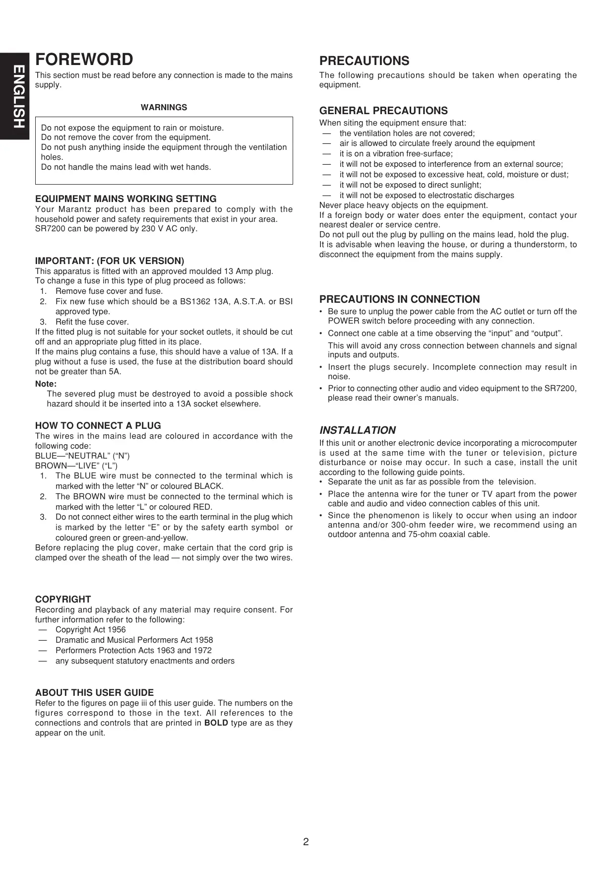 Your Marantz product has been prepared to comply with the household power and safety requirements that exist in your area. SR7200 can be powered by 230 V AC only. IMPORTANT: (FOR UK VERSION) This apparatus is fitted with an approved moulded 13 Amp plug. To change a fuse in this type of plug proceed as follows:
