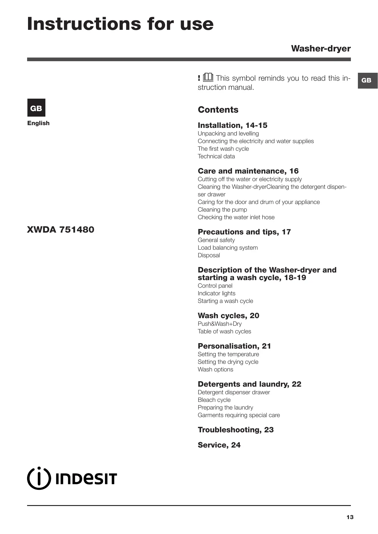 IWDC7145 - Washer dryer INDESIT - Free user manual and instructions