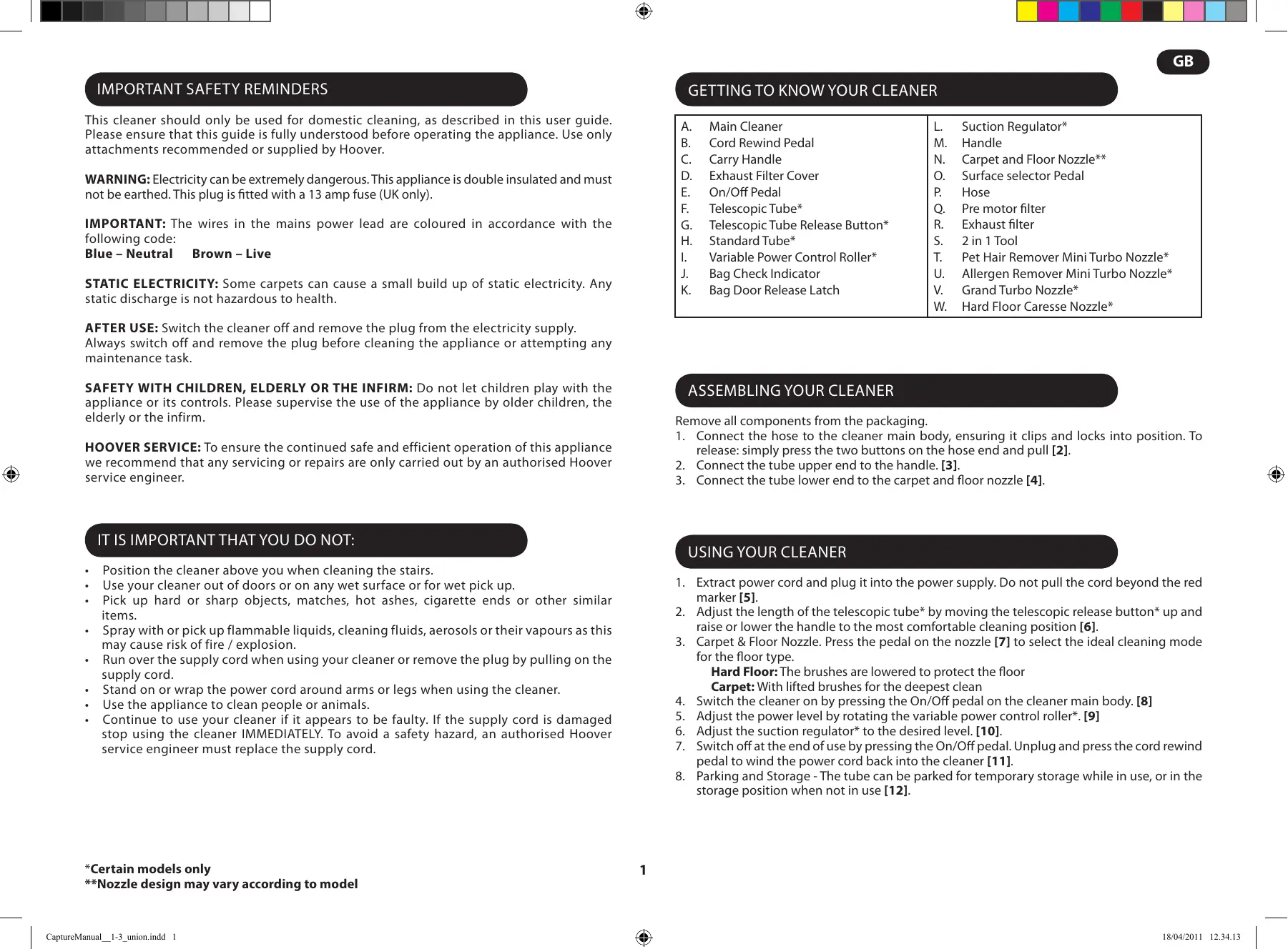 Using your cleaner Position the cleaner above you when cleaning the stairs. Use your cleaner out of doors or on any wet surface or for wet pick up. Pick up hard or sharp objects, matches, hot ashes, cigarette ends or other similar items. Spray with or pick up flammable liquids, cleaning fluids, aerosols or their vapours as this may cause risk of fire / explosion. Run over the supply cord when using your cleaner or remove the plug by pulling on the supply cord. Stand on or wrap the power cord around arms or legs when using the cleaner. Use the appliance to clean people or animals. Continue to use your cleaner if it appears to be faulty. If the supply cord is damaged stop using the cleaner IMMEDIATELY. To avoid a safety hazard, an authorised Hoover service engineer must replace the supply cord. *Certain models only **Nozzle design may vary according to model CaptureManual__1-3_union.indd 1