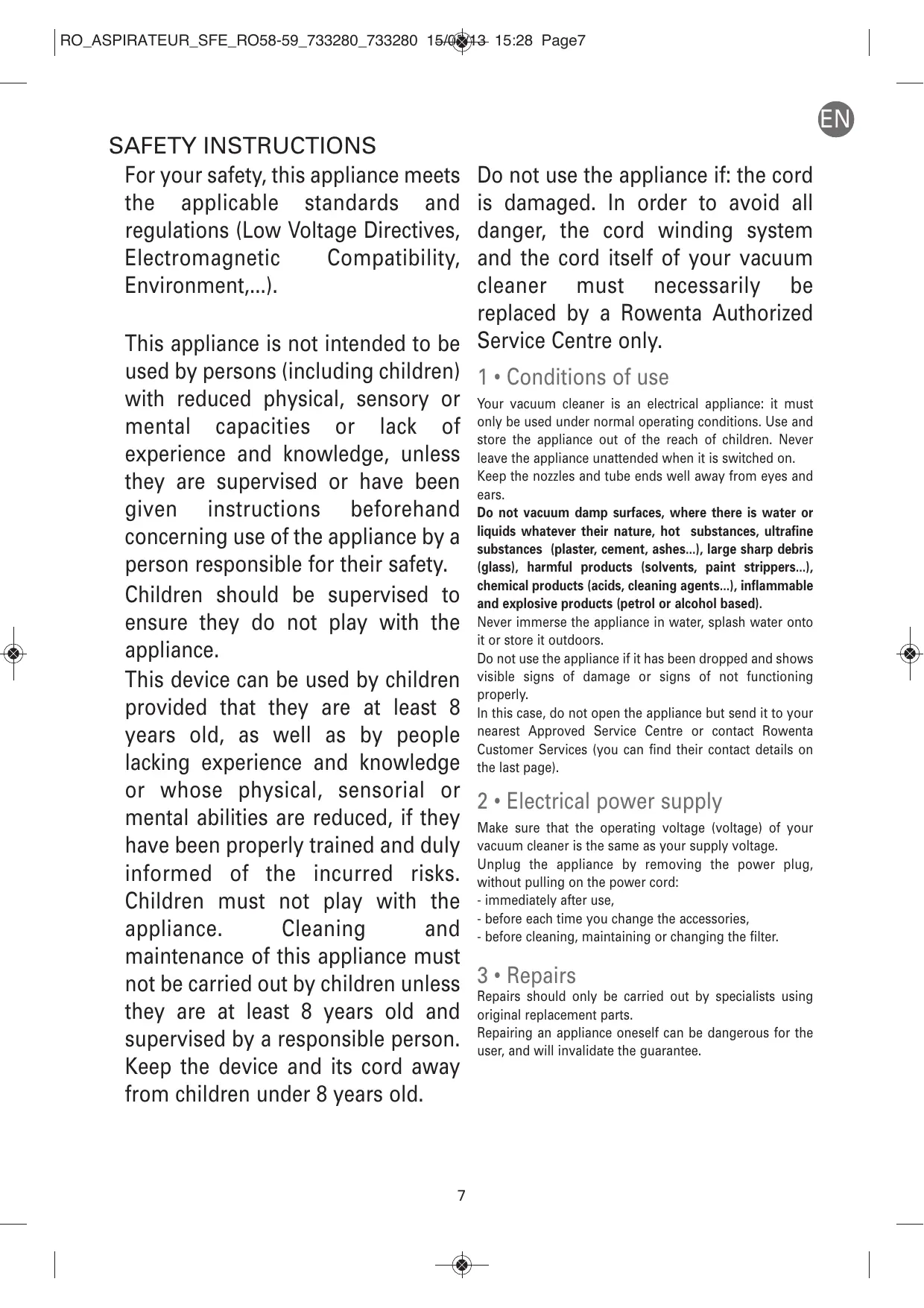 SAFETY INSTRUCTIONS For your safety, this appliance meets the applicable standards and regulations (Low Voltage Directives, Electromagnetic Compatibility, Environment,...). Do not use the appliance if: the cord is damaged. In order to avoid all danger, the cord winding system and the cord itself of your vacuum cleaner must necessarily be replaced by a Rowenta Authorized This appliance is not intended to be Service Centre only. used by persons (including children) 1 • Conditions of use with reduced physical, sensory or Your vacuum cleaner is an electrical appliance: it must only be used under normal operating conditions. Use and mental capacities or lack of store the appliance out of the reach of children. Never experience and knowledge, unless leave the appliance unattended when it is switched on. the nozzles and tube ends well away from eyes and they are supervised or have been Keep ears. given instructions beforehand Do not vacuum damp surfaces, where there is water or whatever their nature, hot substances, ultrafine concerning use of the appliance by a liquids substances (plaster, cement, ashes...), large sharp debris person responsible for their safety. (glass), harmful products (solvents, paint strippers...), chemical products (acids, cleaning agents...), inflammable Children should be supervised to and explosive products (petrol or alcohol based). ensure they do not play with the Never immerse the appliance in water, splash water onto it or store it outdoors. appliance. Do not use the appliance if it has been dropped and shows This device can be used by children visible signs of damage or signs of not functioning properly. provided that they are at least 8 In this case, do not open the appliance but send it to your Approved Service Centre or contact Rowenta years old, as well as by people nearest Customer Services (you can find their contact details on lacking experience and knowledge the last page). or whose physical, sensorial or 2 • Electrical power supply mental abilities are reduced, if they Make sure that the operating voltage (voltage) of your have been properly trained and duly vacuum cleaner is the same as your supply voltage. Unplug the appliance by removing the power plug, informed of the incurred risks. without pulling on the power cord: Children must not play with the - immediately after use, - before each time you change the accessories, appliance. Cleaning and - before cleaning, maintaining or changing the filter. maintenance of this appliance must
