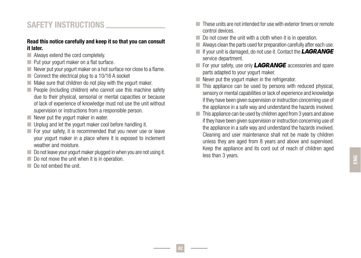 ■■ Always extend the cord completely. ■■ Put your yogurt maker on a flat surface. ■■ Never put your yogurt maker on a hot surface nor close to a flame. ■■ Connect the electrical plug to a 10/16 A socket ■■ Make sure that children do not play with the yogurt maker. ■■ People (including children) who cannot use this machine safety due to their physical, sensorial or mental capacities or because of lack of experience of knowledge must not use the unit without supervision or instructions from a responsible person. ■■ Never put the yogurt maker in water. ■■ Unplug and let the yogurt maker cool before handling it. ■■ For your safety, it is recommended that you never use or leave your yogurt maker in a place where it is exposed to inclement weather and moisture. ■■ Do not leave your yogurt maker plugged in when you are not using it. ■■ Do not move the unit when it is in operation. ■■ Do not embed the unit.