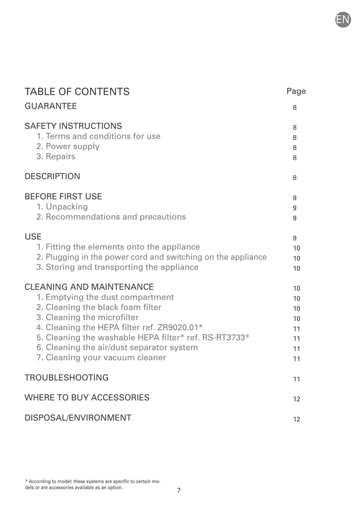 1. Emptying the dust compartment 2. Cleaning the black foam filter 3. Cleaning the microfilter 4. Cleaning the HEPA filter ref. ZR9020.01* 5. Cleaning the washable HEPA filter* ref. RS-RT3733* 6. Cleaning the air/dust separator system 7. Cleaning your vacuum cleaner