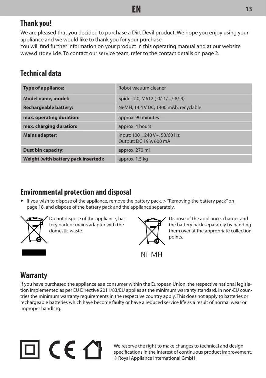 If the appliance, the mains adapter or the mains adapter cord are damaged, they will need to be replaced by the manufacturer, the manufacturer’s customer service departInformation on the battery pack ment or a similarly qualified person in order There is a risk of injury if rechargeable batto prevent hazards. teries are handled incorrectly. Hand over a faulty appliance to an au Only use the charger included in the scope of supply to charge the battery pack. thorised dealer or send it to the Dirt Devil customer service department for repairs, Never short-circuit the battery pack, i.e. > “International Services” on page 2. never touch both poles simultaneously, especially with electrically conductive objects. Never use a faulty appliance, mains adapter, mains adapter cord or rechargea It it is necessary to replace the battery ble battery! pack, contact a specialist dealer or the Dirt Devil customer service department, > “Inter- Information on proper use This appliance must only be used for donational Services” on page 2. Never replace mestic use. It is not suitable for industrial the battery pack yourself. Do not under any or commercial use. The appliance must oncircumstances replace the battery pack with ly be used to clean on level hard floors with other batteries, rechargeable or otherwise. normal dirt and accumulation. If the round Never take the battery pack apart and brooms are not installed, the appliance can never expose it to high temperatures. also be used on short pile carpet. Improper handling can cause liquid to leak from the battery pack. Avoid any contact with such liquid. If you have come into contact with liquid, rinse it off with copious amounts of water and consult a doctor. After its service life, dispose of the appliance and the battery pack in an environmentally friendly manner, as described, > “Environmental protection and disposal” on page 13. Before cleaning or performing maintenance on the appliance, ensure that the appliance is switched off and that the mains adapter is not connected.