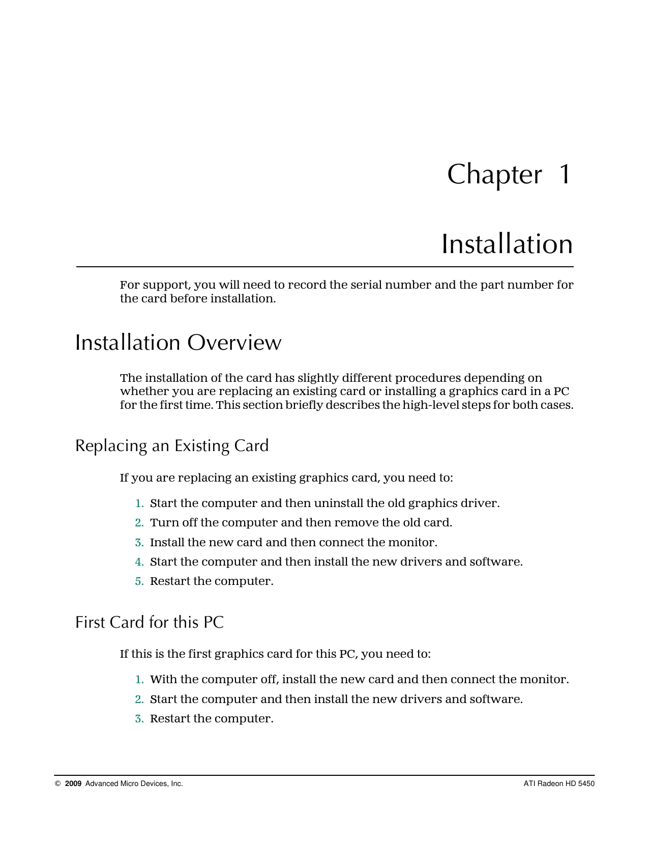 © 2009 Advanced Micro Devices, Inc. ATI Radeon HD 5450 2 Installation Record the Serial and Part Numbers Write down the serial number and part number before installing. The serial number and 102 part number on the graphics card are required for registration and free support. They are located on a sticker on the back of the card. The emphasized numbers in bold are required for registration and free support. Figure 1–1 Sample Serial and Part Numbers Uninstalling the Old Driver (Windows® XP) Follow these steps to uninstall the existing graphics card driver in preparation for installation of a new card.