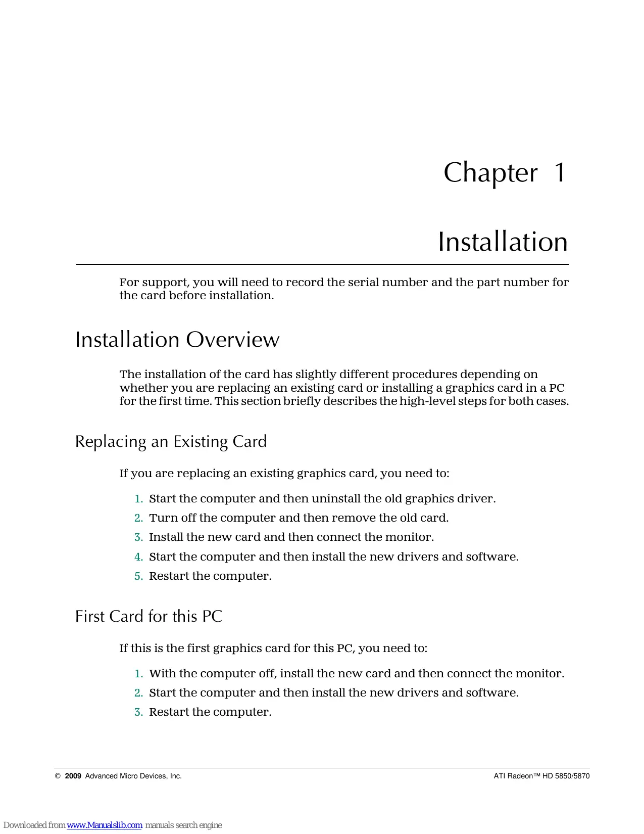 computer, if necessary. © 2009 Advanced Micro Devices, Inc. Downloaded from www.Manualslib.com manuals search engine ATI Radeon™ HD 5850/5870 4 Installation
