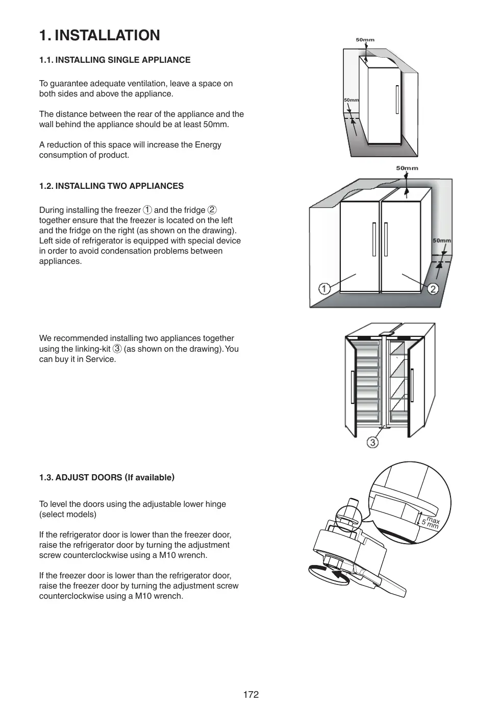A reduction of this space will increase the Energy consumption of product. 1.2. INSTALLING TWO APPLIANCES During installing the freezer 1 and the fridge 2 together ensure that the freezer is located on the left and the fridge on the right (as shown on the drawing). Left side of refrigerator is equipped with special device in order to avoid condensation problems between appliances.