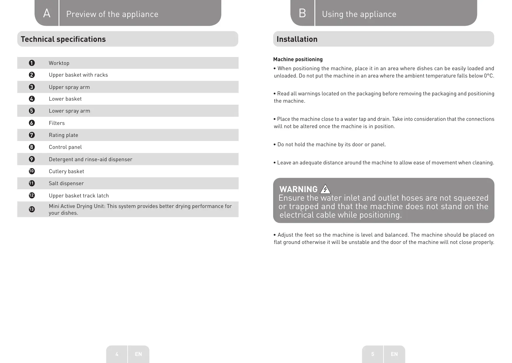 - Leave an adequate distance around the machine to allow ease of movement when cleaning. WARNING Ensure the water inlet and outlet hoses are not squeezed or trapped and that the machine does not stand on the electrical cable while positioning.