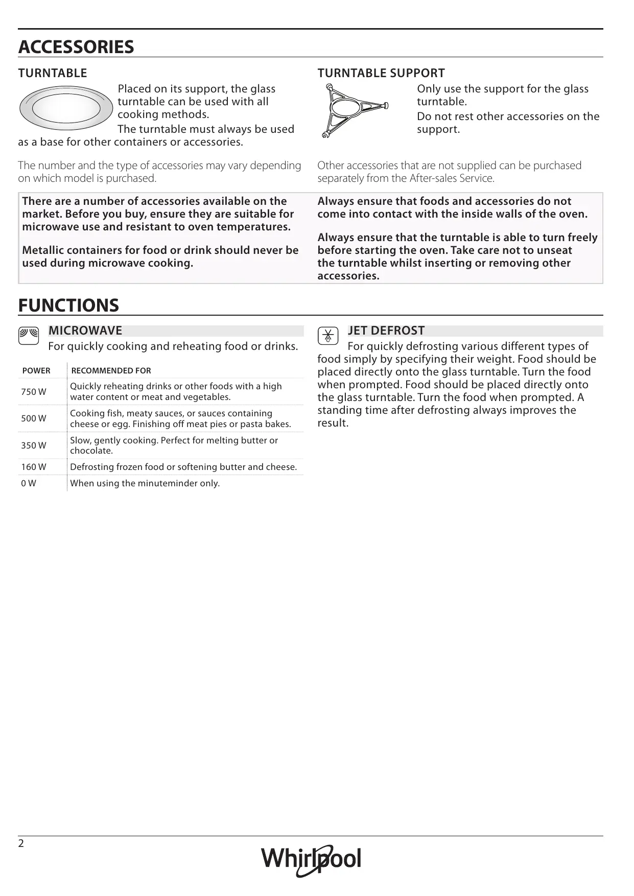 JET DEFROST For quickly defrosting various different types of food simply by specifying their weight. Food should be placed directly onto the glass turntable. Turn the food when prompted. Food should be placed directly onto the glass turntable. Turn the food when prompted. A standing time after defrosting always improves the result.
